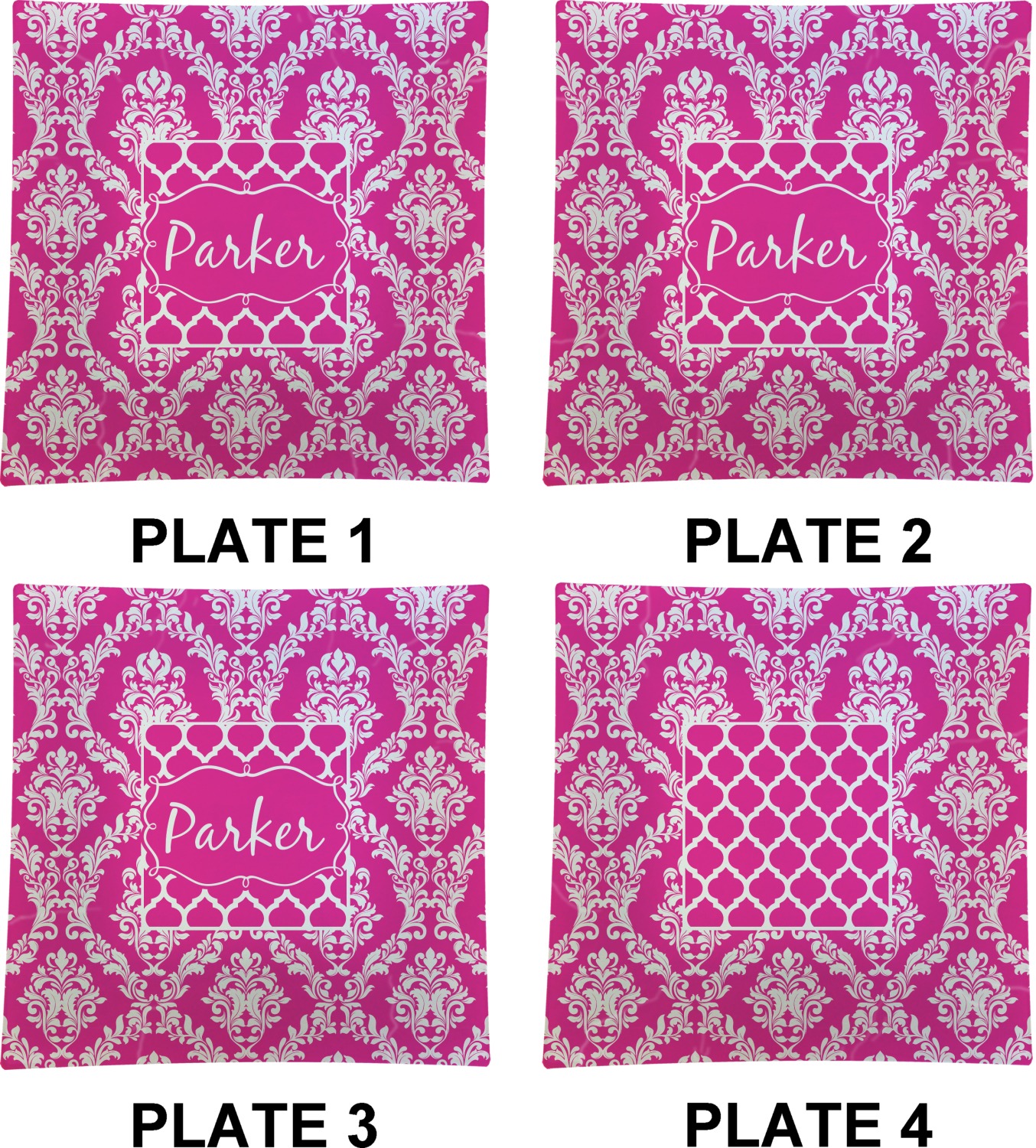 This is one of our new concentric design style - where you can use any two patterns together - we have chose to feature our damask and moroccan / trellis patterns. We chose our hot pink and white for our colors and curlz label with a name for personalization.
