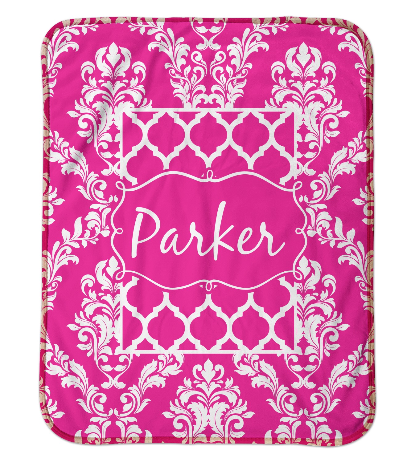 This is one of our new concentric design style - where you can use any two patterns together - we have chose to feature our damask and moroccan / trellis patterns. We chose our hot pink and white for our colors and curlz label with a name for personalization.