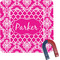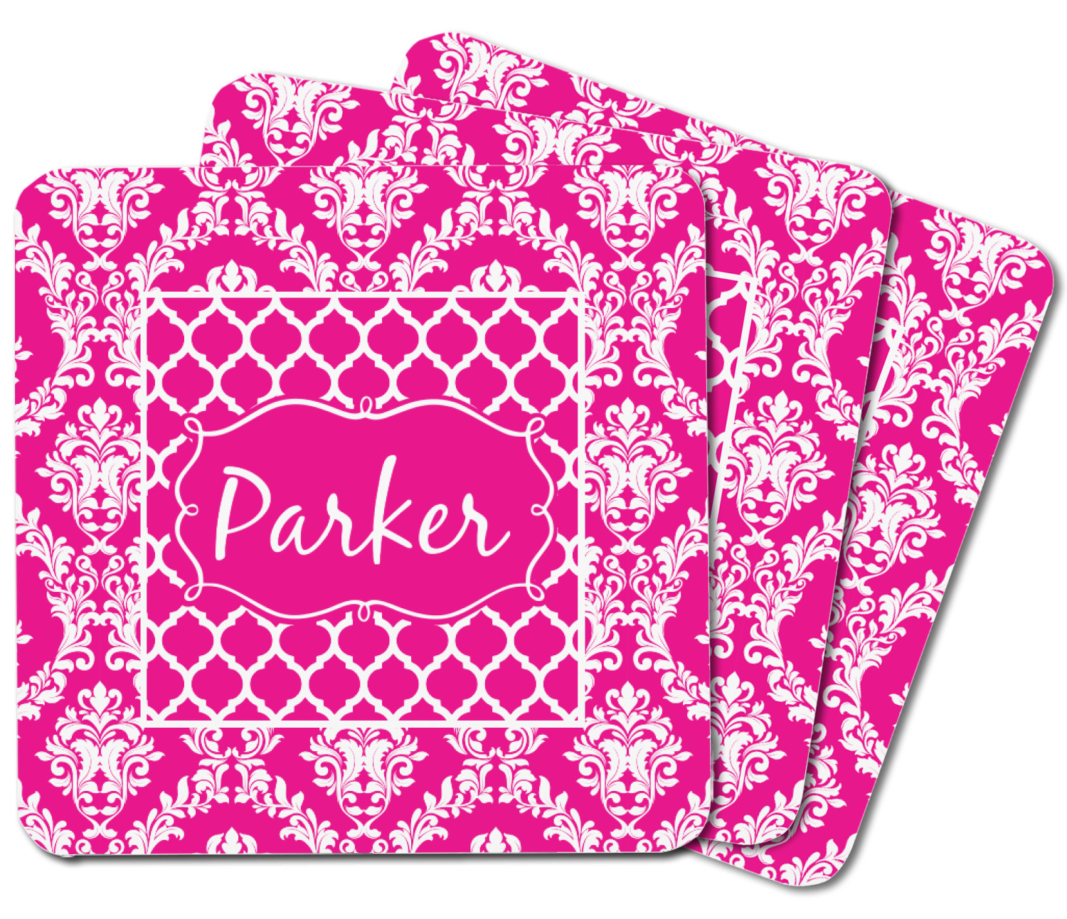 This is one of our new concentric design style - where you can use any two patterns together - we have chose to feature our damask and moroccan / trellis patterns. We chose our hot pink and white for our colors and curlz label with a name for personalization.