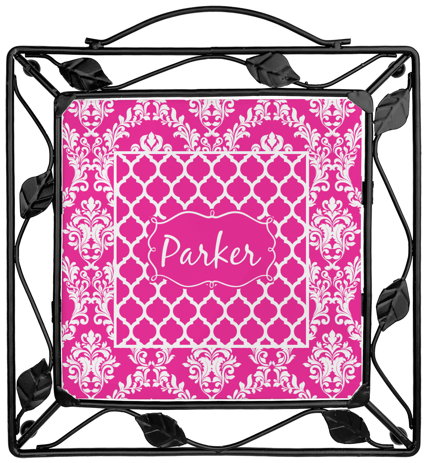 Our square trivets are made from a durable, wrought iron. This model features 4 small half circles, one on each corner, and a larger ring of iron that circles the central, customized tile. Each of the 4 corners has a round foot on its bottom for stability. This trivet is 8.75 by 8.75 inches, but the central tile measures at 6 inches on both sides.
