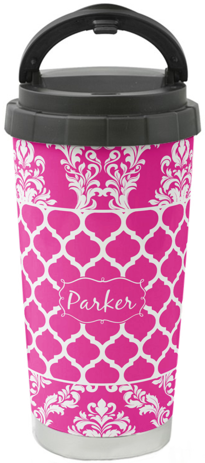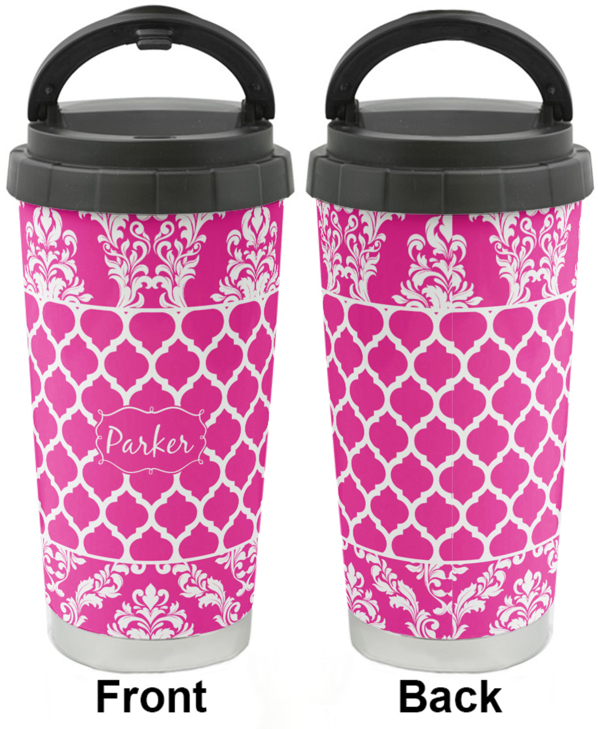 This is one of our new concentric design style - where you can use any two patterns together - we have chose to feature our damask and moroccan / trellis patterns. We chose our hot pink and white for our colors and curlz label with a name for personalization.