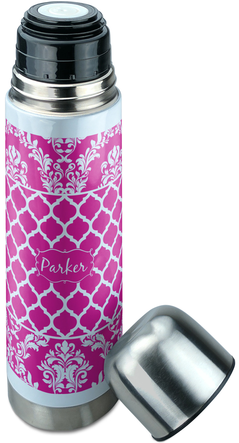 Manufactured from stainless steel, this thermos is built durably and double-walled insulated to preserve the temperature of your drink for hours. It also features a screw off lid that is made to also function as a small cup. Upon unscrewing this part of the thermos bottle, a pop-open, pour feature emerges. This feature allows you to slowly pour your beverage into your lid, ensuring a steady, controlled pour into your lid or other cup. With a capacity of 25 ounces, these large thermoses can hold several servings of your favorite beverage. Your customization is displayed all around the bottle with bright, vibrant color.