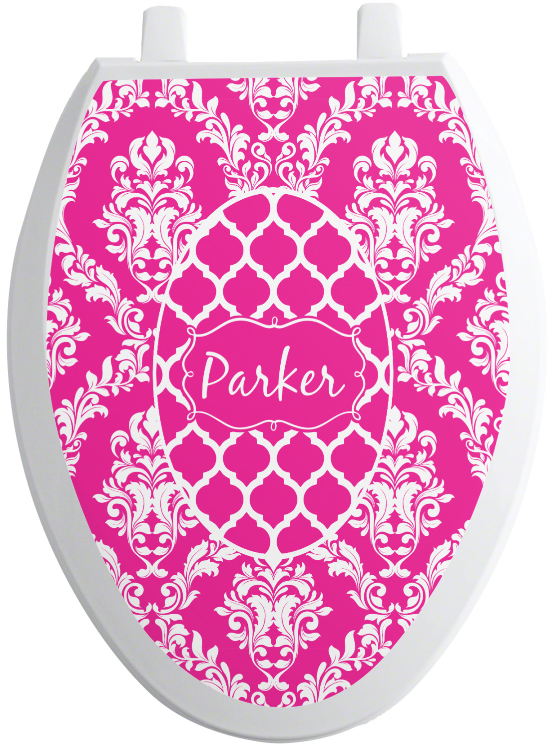 This is one of our new concentric design style - where you can use any two patterns together - we have chose to feature our damask and moroccan / trellis patterns. We chose our hot pink and white for our colors and curlz label with a name for personalization.