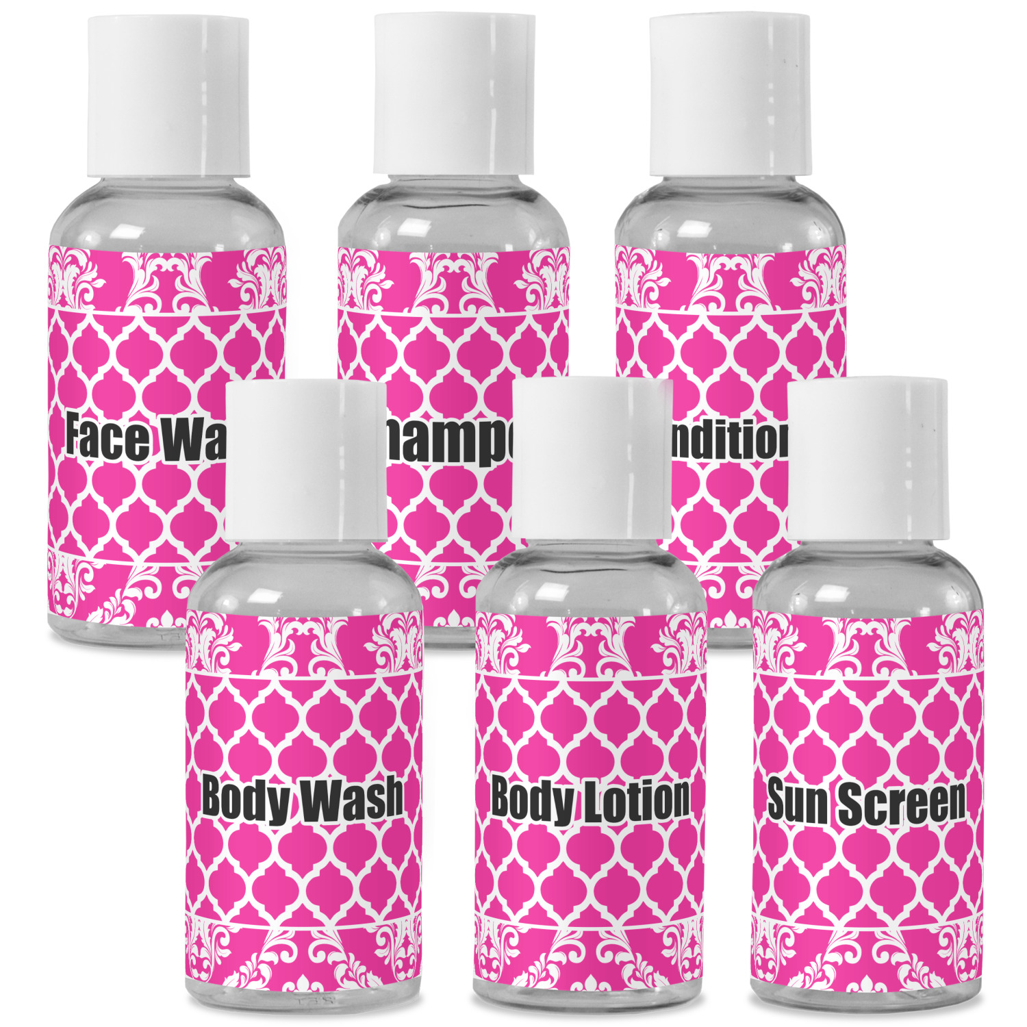 These soap and lotion travel bottles are the perfect place to start. Each set comes with 6 clear plastic bottles with white pop top lids. The bottles are cylindrical and can hold approximately 2.7oz. Perfect for plane travel!