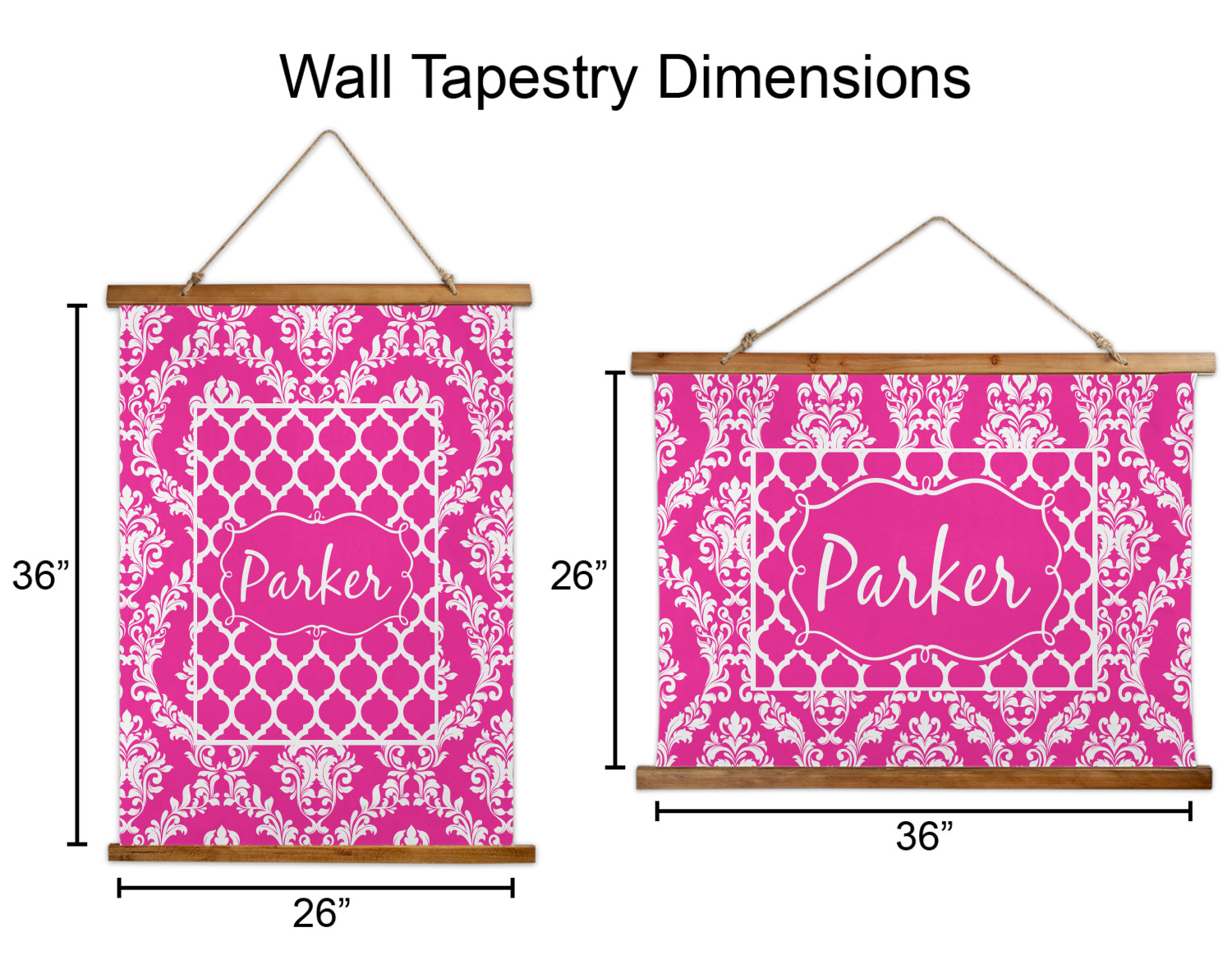 Made in two different orientations - portrait or landscape - both are 26" x 36". Your design is printed on a high quality polyester fabric with hemmed edges. The wood on the top and bottom of the tapestry is 1.25" tall and 0.25" thick and there are two pieces on top and bottom which sandwich the fabric.