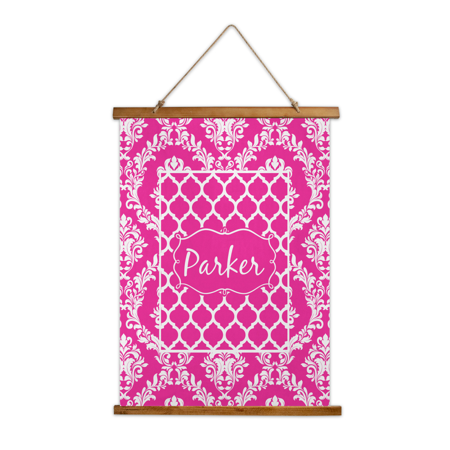 This is one of our new concentric design style - where you can use any two patterns together - we have chose to feature our damask and moroccan / trellis patterns. We chose our hot pink and white for our colors and curlz label with a name for personalization.
