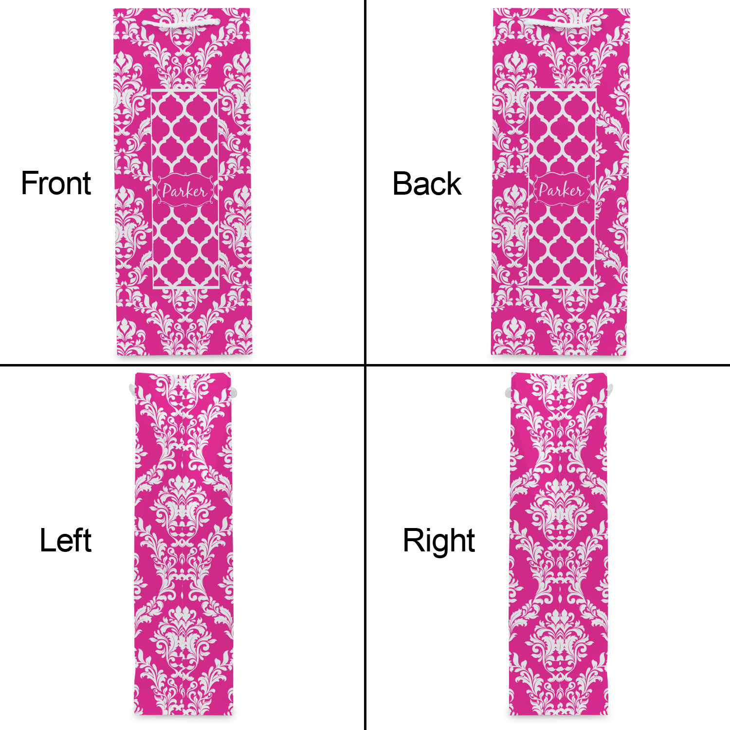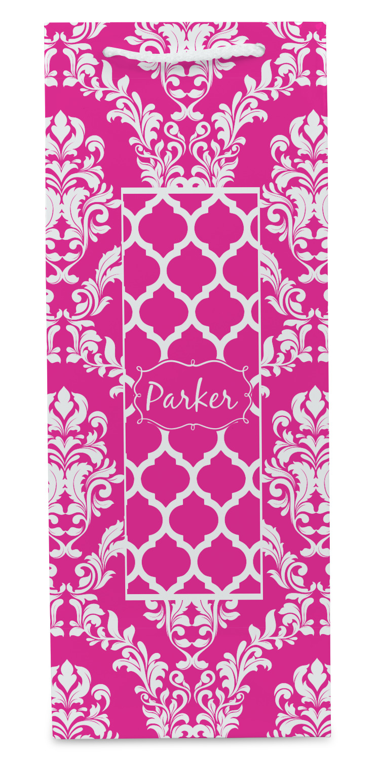 This is one of our new concentric design style - where you can use any two patterns together - we have chose to feature our damask and moroccan / trellis patterns. We chose our hot pink and white for our colors and curlz label with a name for personalization.