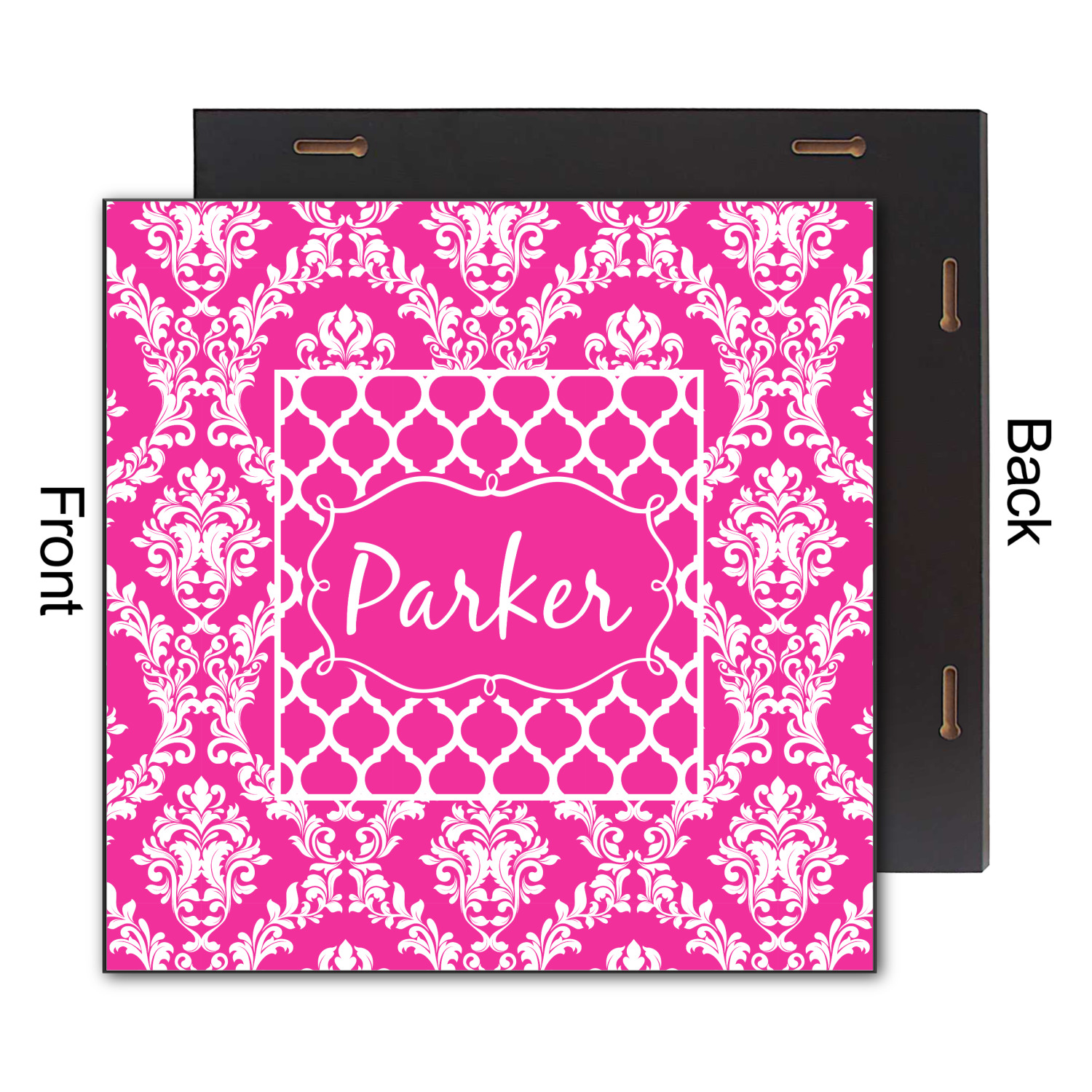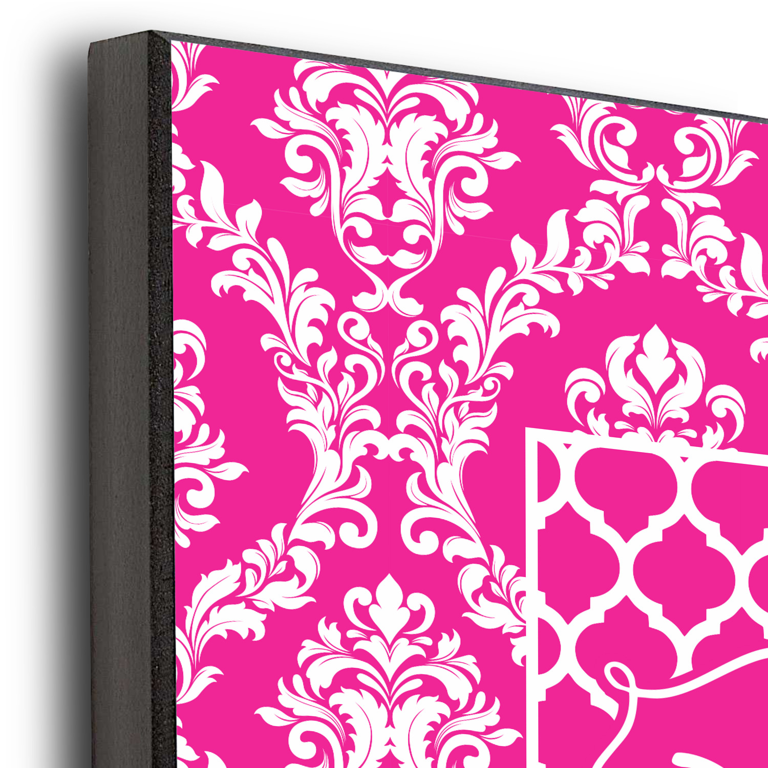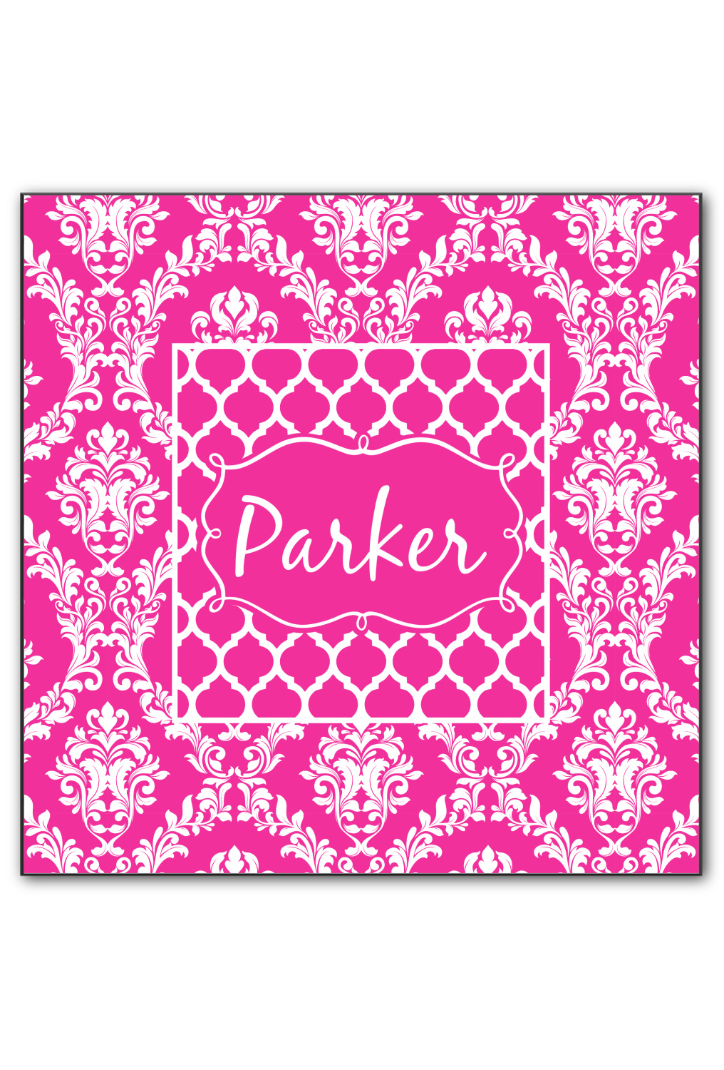 This is one of our new concentric design style - where you can use any two patterns together - we have chose to feature our damask and moroccan / trellis patterns. We chose our hot pink and white for our colors and curlz label with a name for personalization.