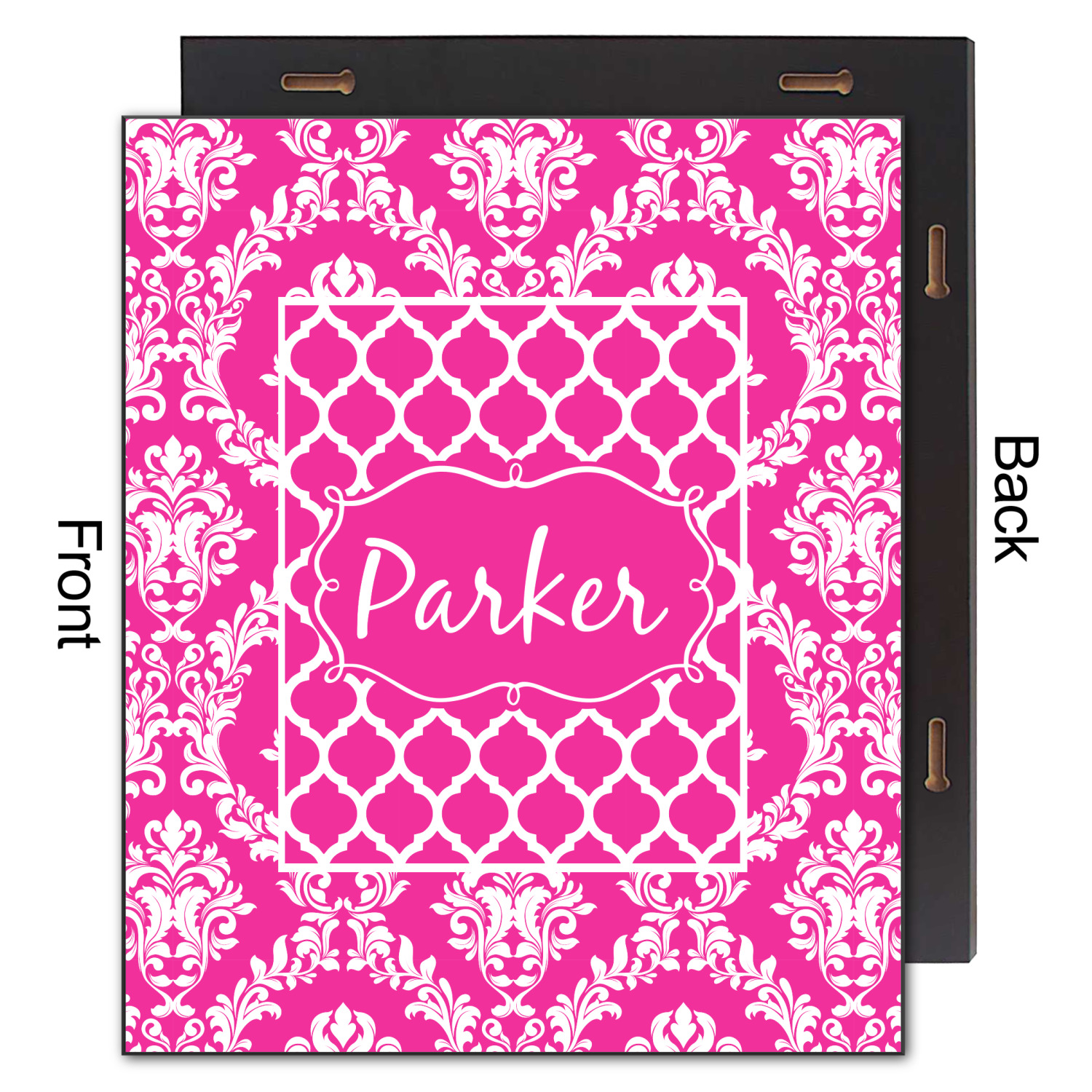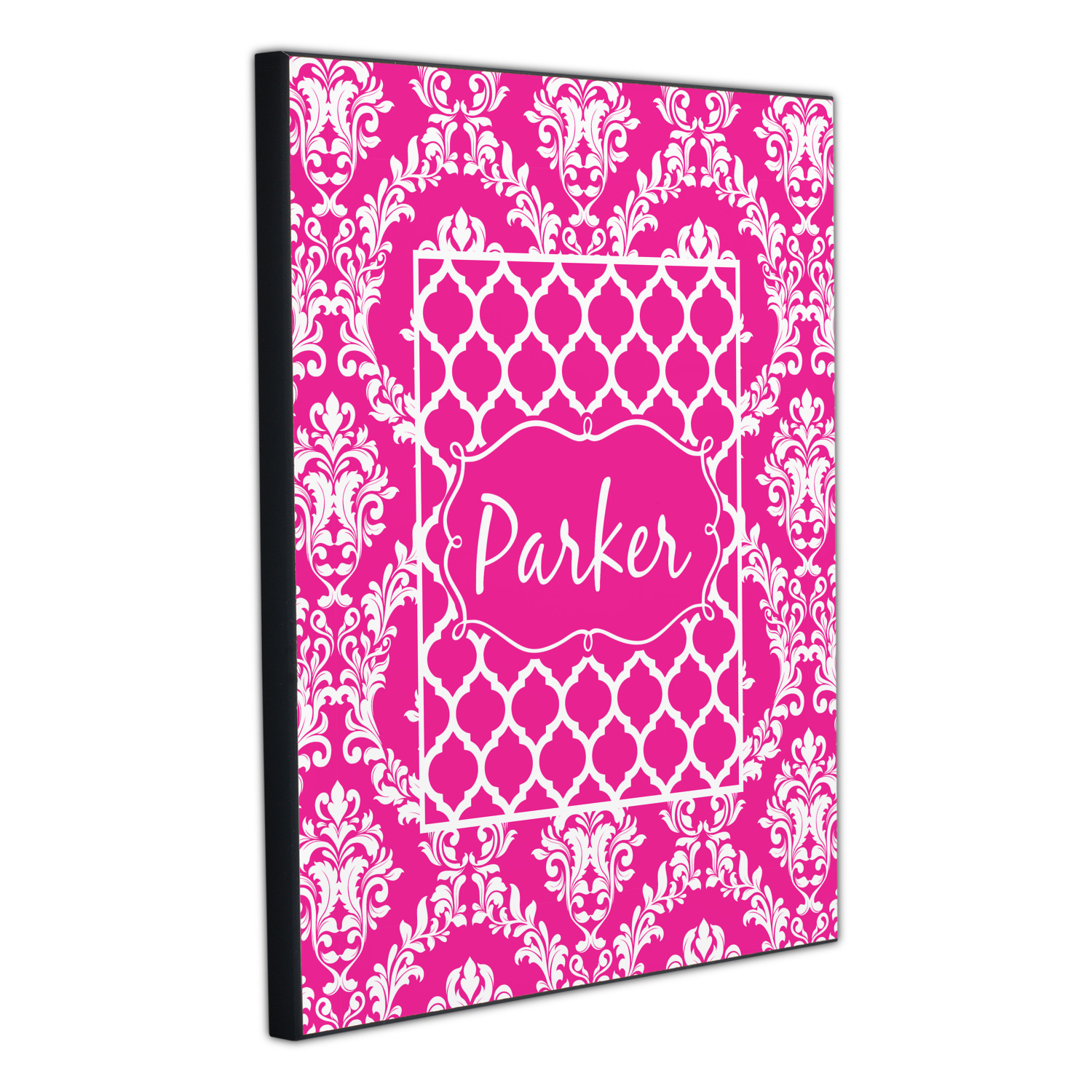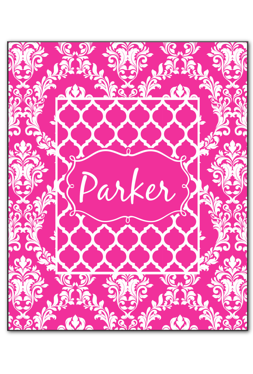 This is one of our new concentric design style - where you can use any two patterns together - we have chose to feature our damask and moroccan / trellis patterns. We chose our hot pink and white for our colors and curlz label with a name for personalization.