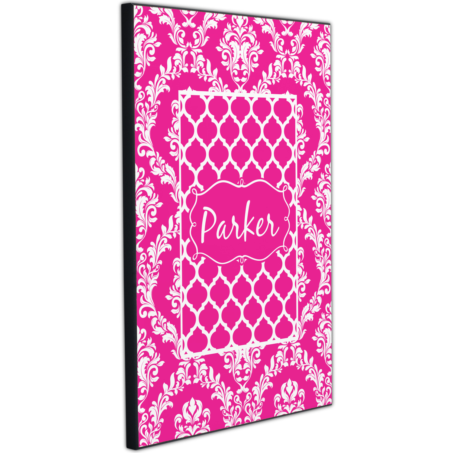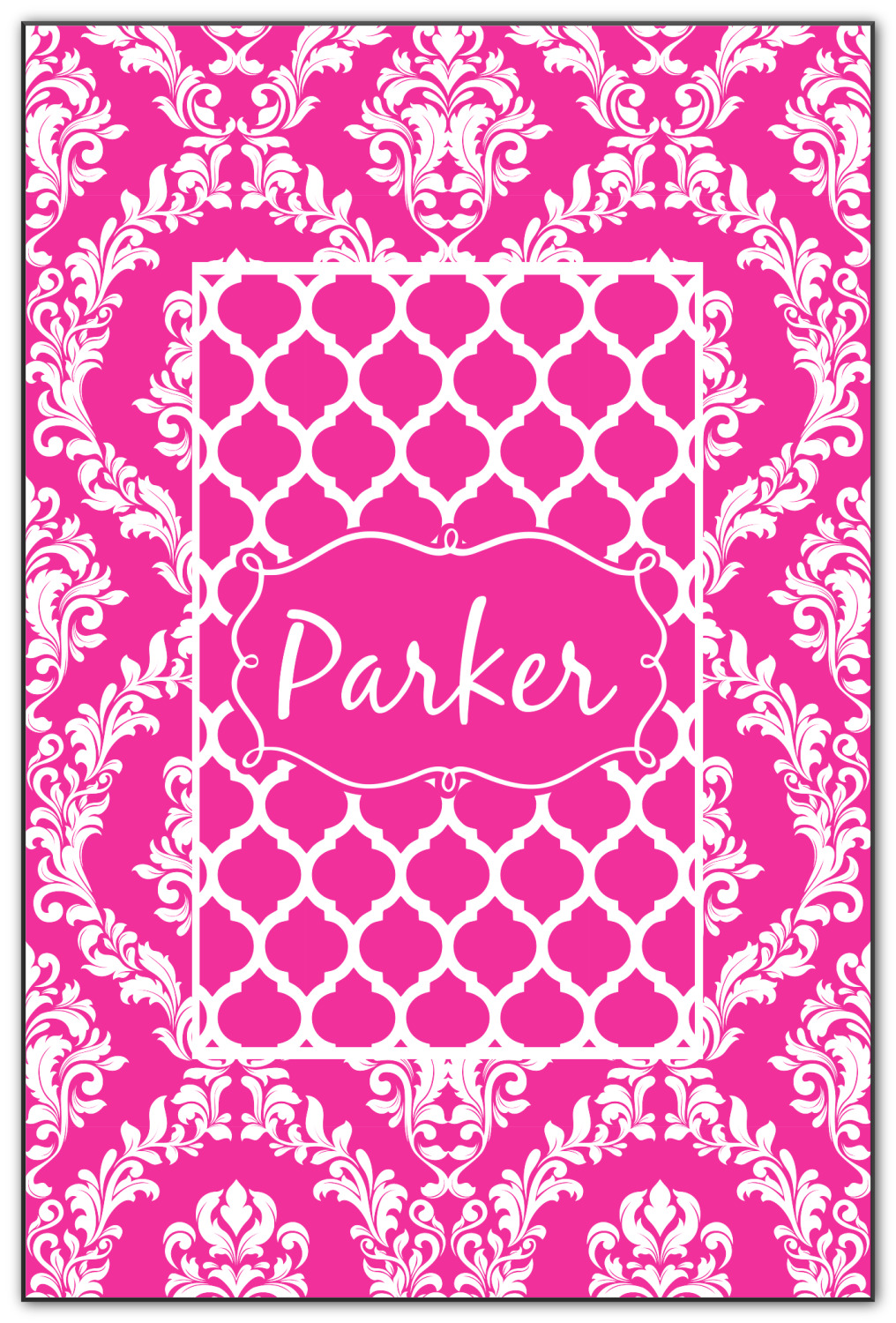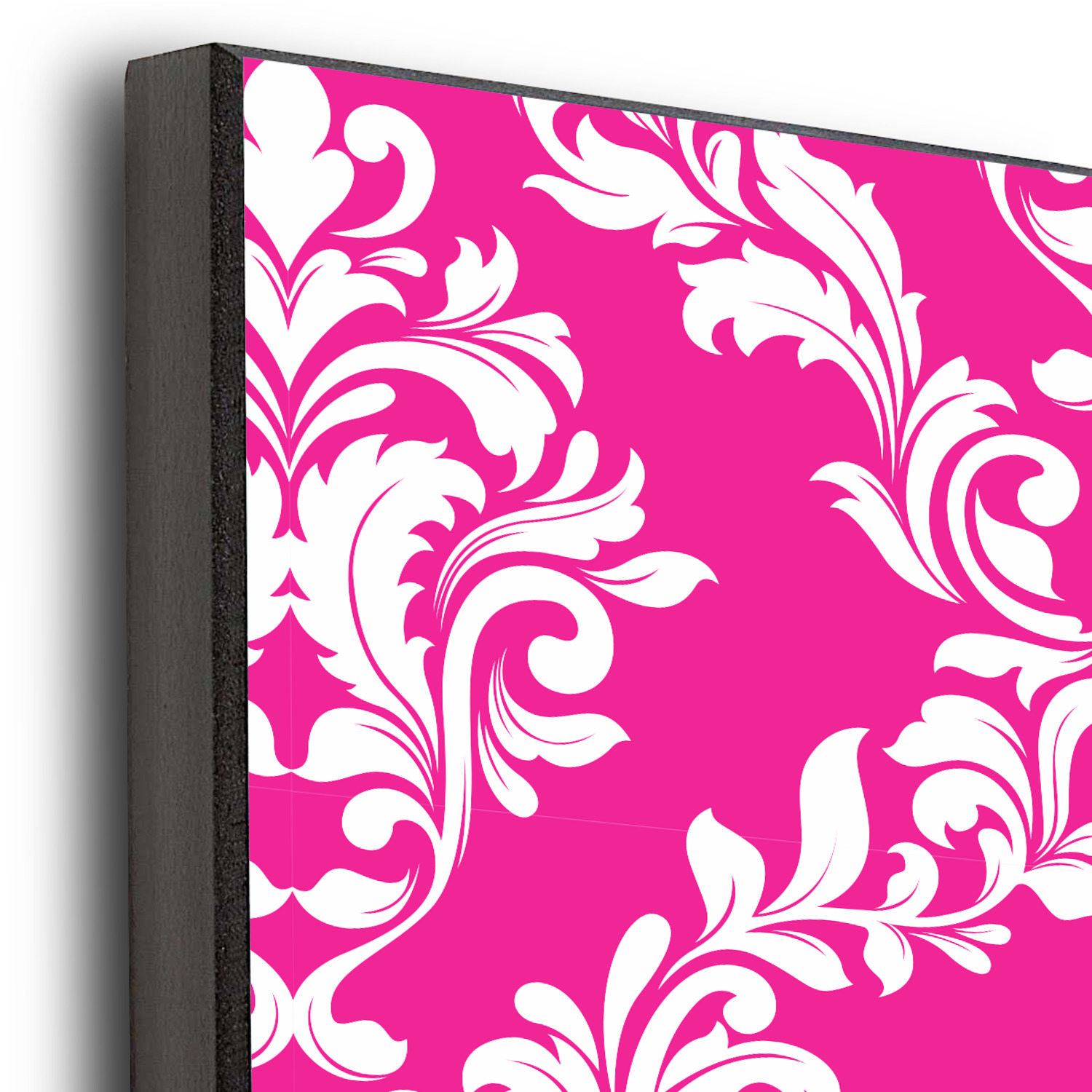 This is one of our new concentric design style - where you can use any two patterns together - we have chose to feature our damask and moroccan / trellis patterns. We chose our hot pink and white for our colors and curlz label with a name for personalization.