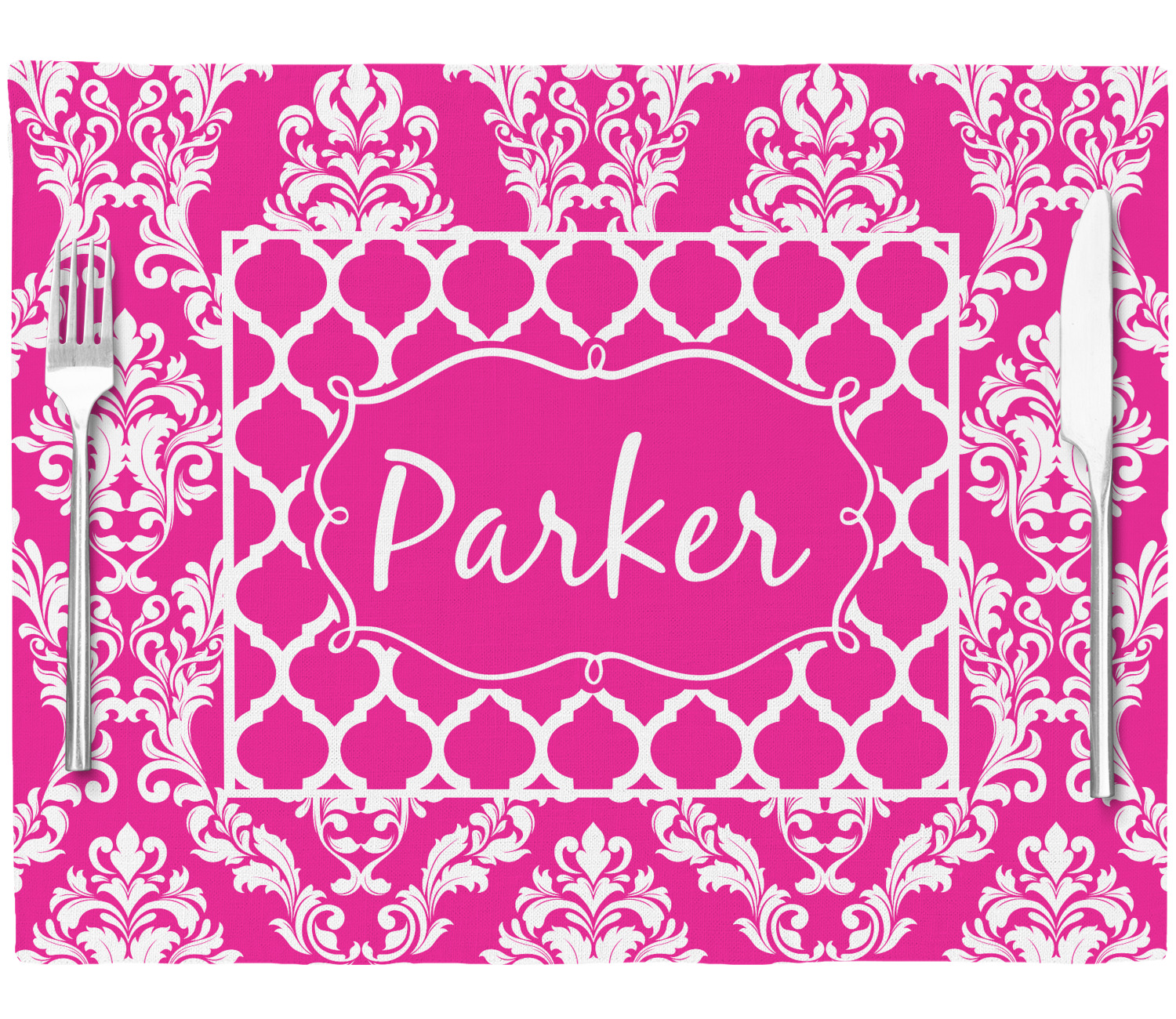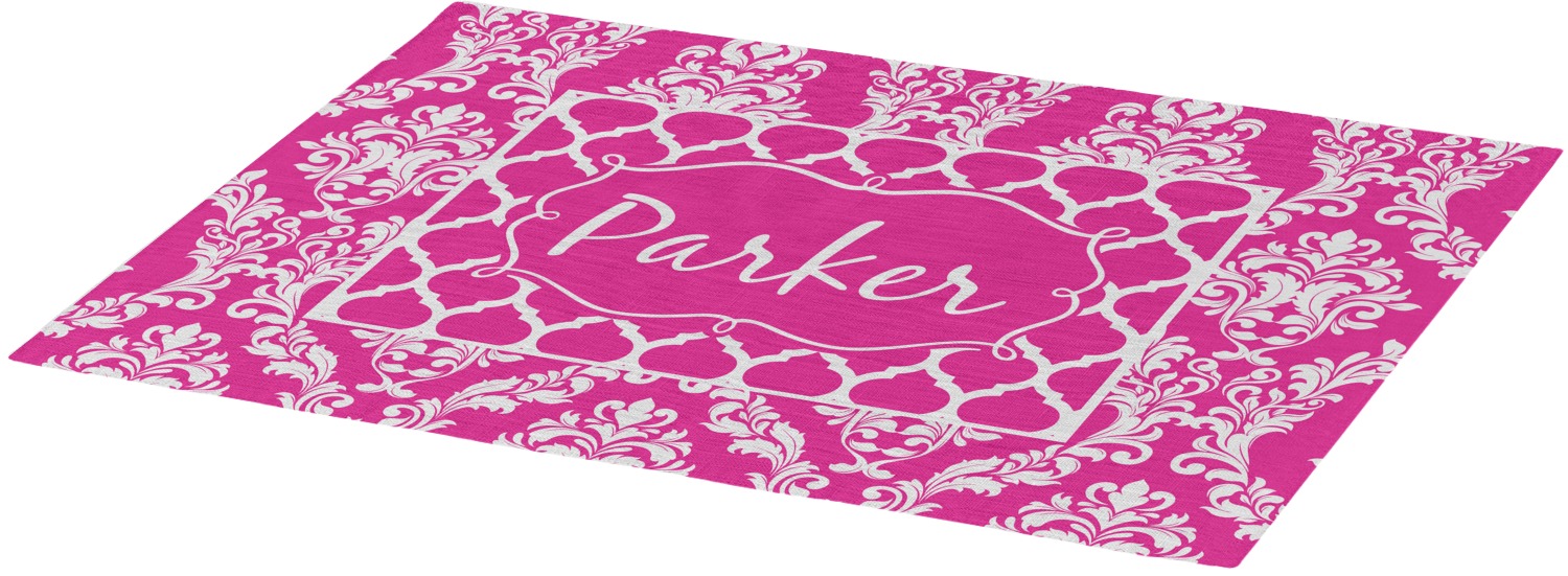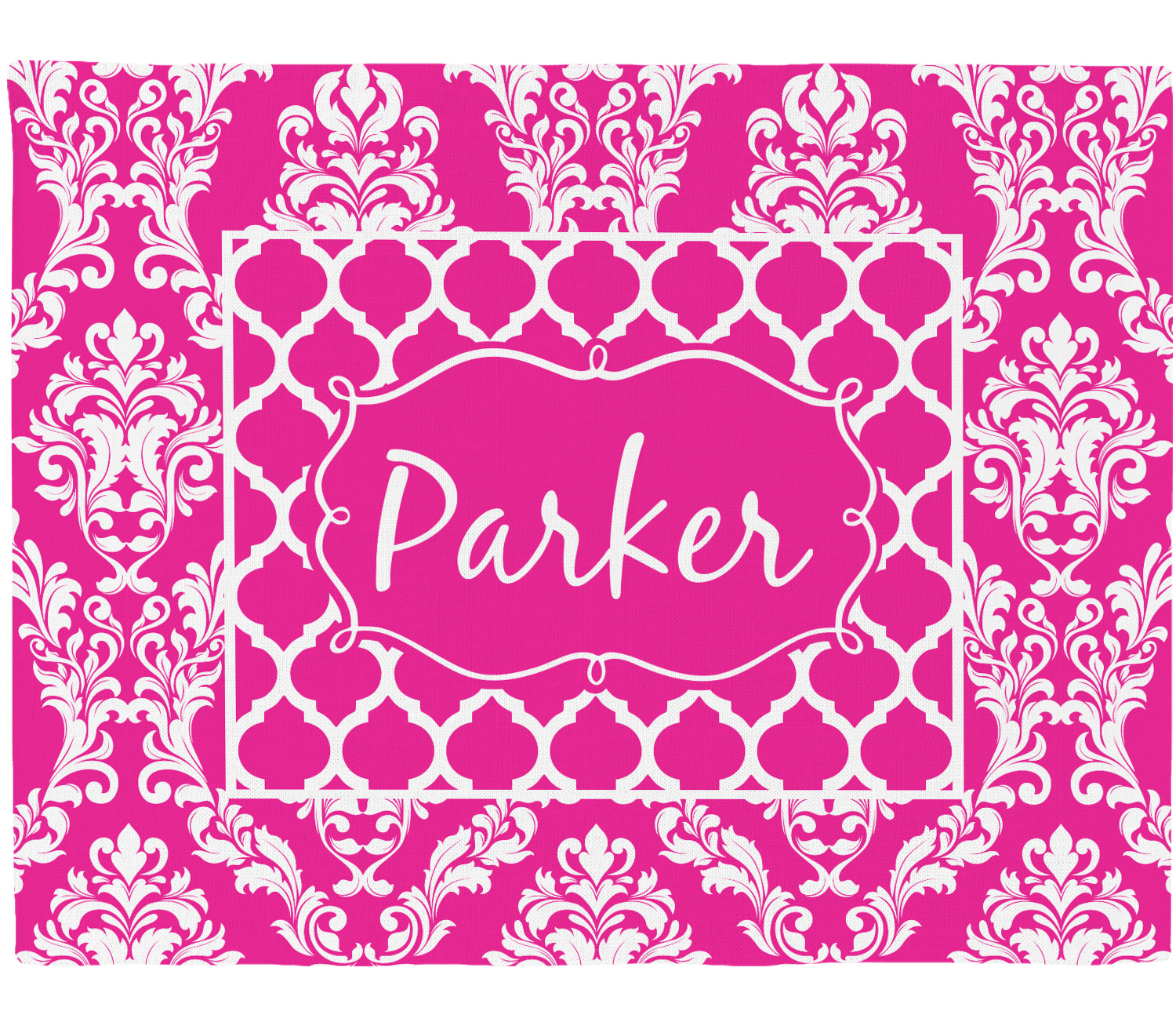 This is one of our new concentric design style - where you can use any two patterns together - we have chose to feature our damask and moroccan / trellis patterns. We chose our hot pink and white for our colors and curlz label with a name for personalization.