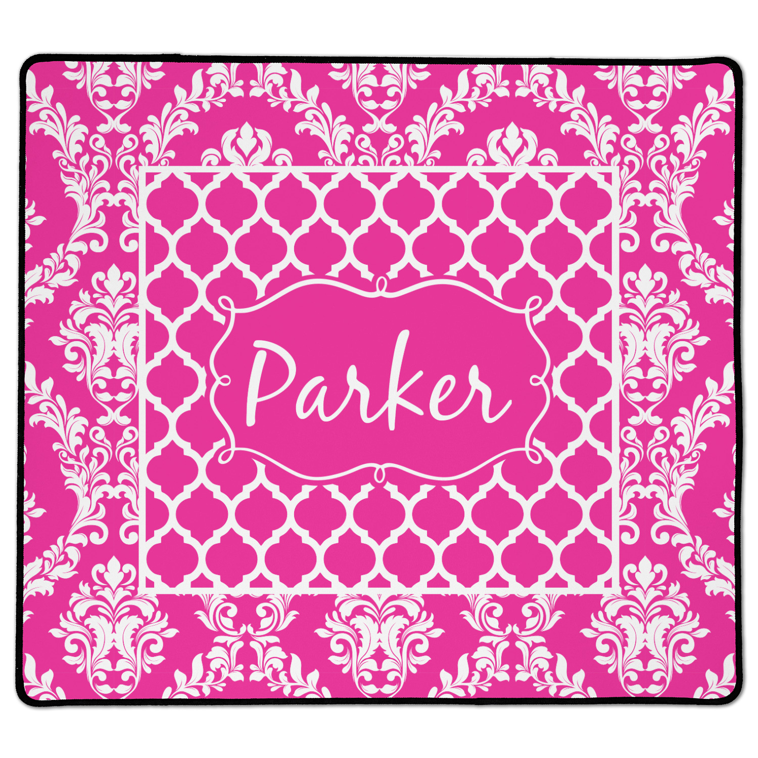This is one of our new concentric design style - where you can use any two patterns together - we have chose to feature our damask and moroccan / trellis patterns. We chose our hot pink and white for our colors and curlz label with a name for personalization.