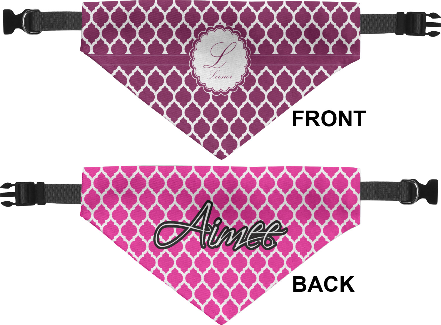 We print the front and back of these dog bandanas with your customized design. The bandana itself is made from a durable polyester, sewn together with a gap large enough to accommodate any collar. Regardless, the bandana includes a plain black, canvas collar with plastic snaps, that can easily be removed if desired. These dog bandana collars are available in four sizes: small, medium, large, and extra large. Please see our sizing chart for more information regarding the dimensions of each size.
