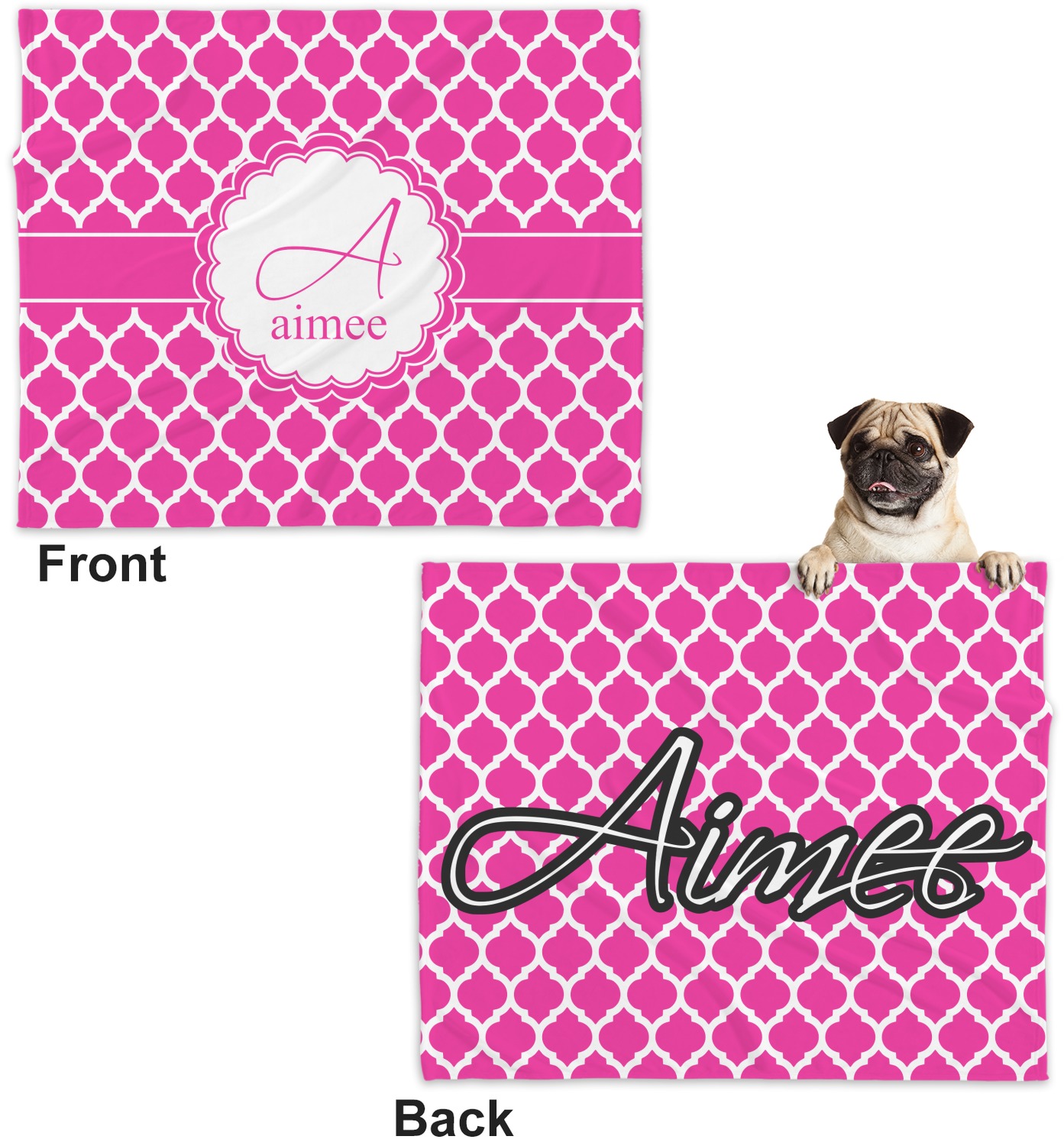 These dog blankets are crafted from a gentle, soft-to-the-touch, minky material. We print your customizations, either matching or differing, on both the top and underside of the blanket. These personalized dog blankets are available in two sizes: regular and large. Our regular size, at 40" x 30", accommodates small and some medium size dogs. At 60" x 50", our large dog blanket is a better fit for bigger breeds. Though specialized for dogs, these blankets still make a thoughtful gift for your favorite feline, or any other pet in mind!