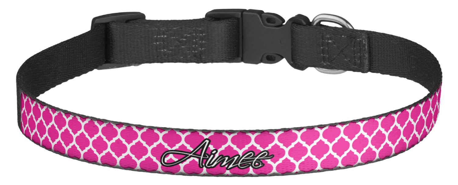 This sturdy collar, made from a durable nylon weave, will outlive your dog's episodes of excited tugging and pulling. Courtesy of its thick plastic buckle and adjuster, this collar is adjustable and accommodating of any dog. Structurally, the collar is a single piece of nylon weave that is sewn together, and features a solid metal loop where you can attach a leash or dog tag. We print and display your dog's name and pattern across the middle of the personalized dog collar.