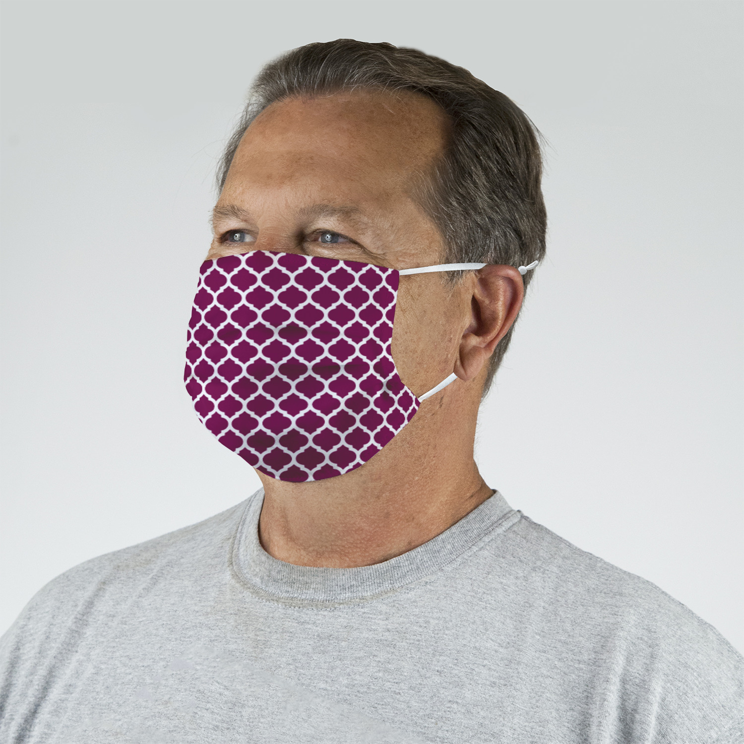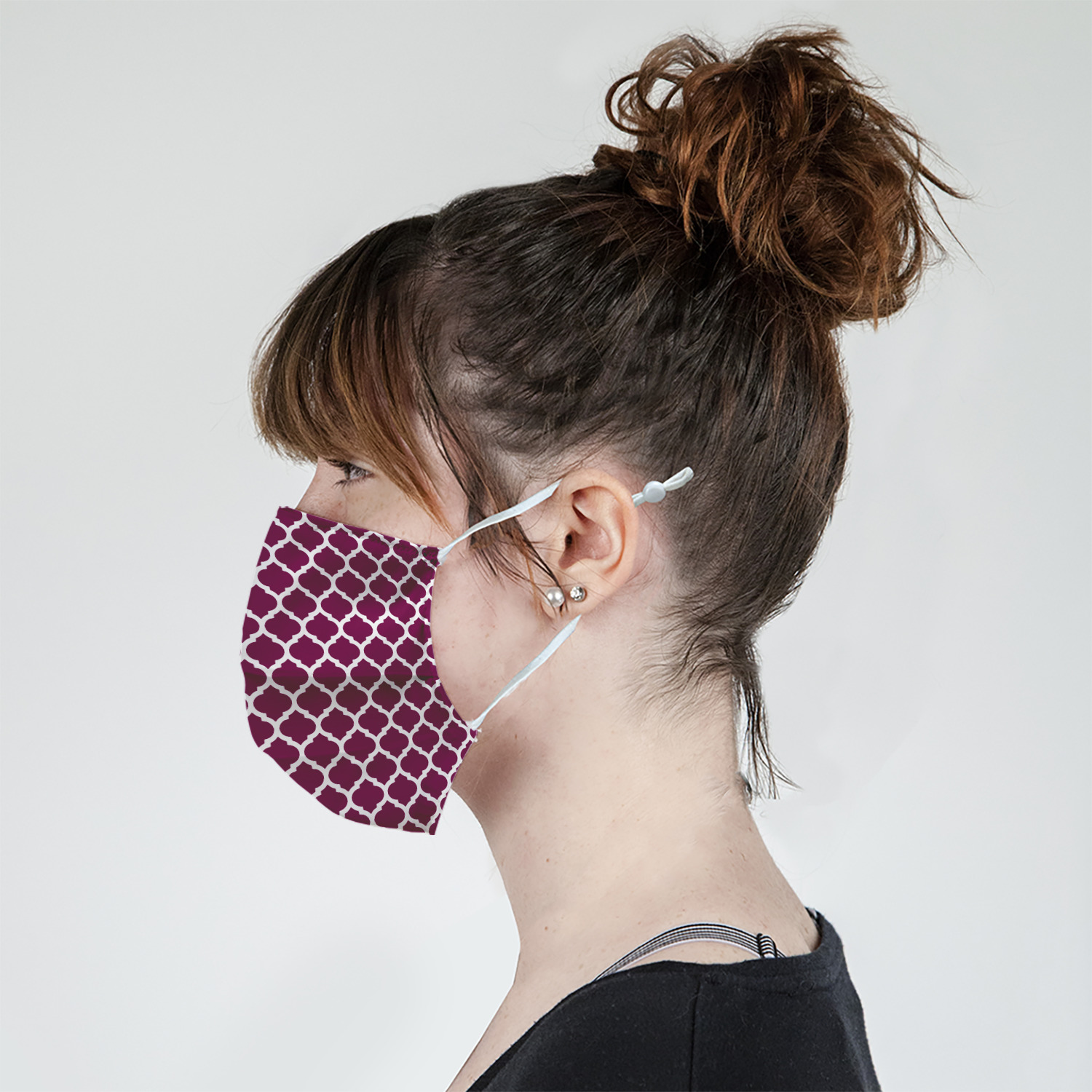 These fun face masks are 7" wide and 3.5" high. They feature pleats, adjustable ear loops, and are made with two layers of fabric. The top layer where your design is printed is a breathable polyester sheeting, while the inside layer is a soft microfiber polyester