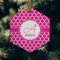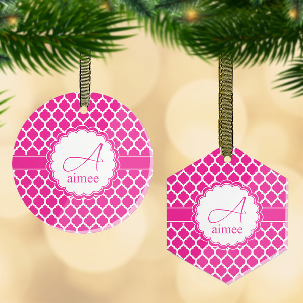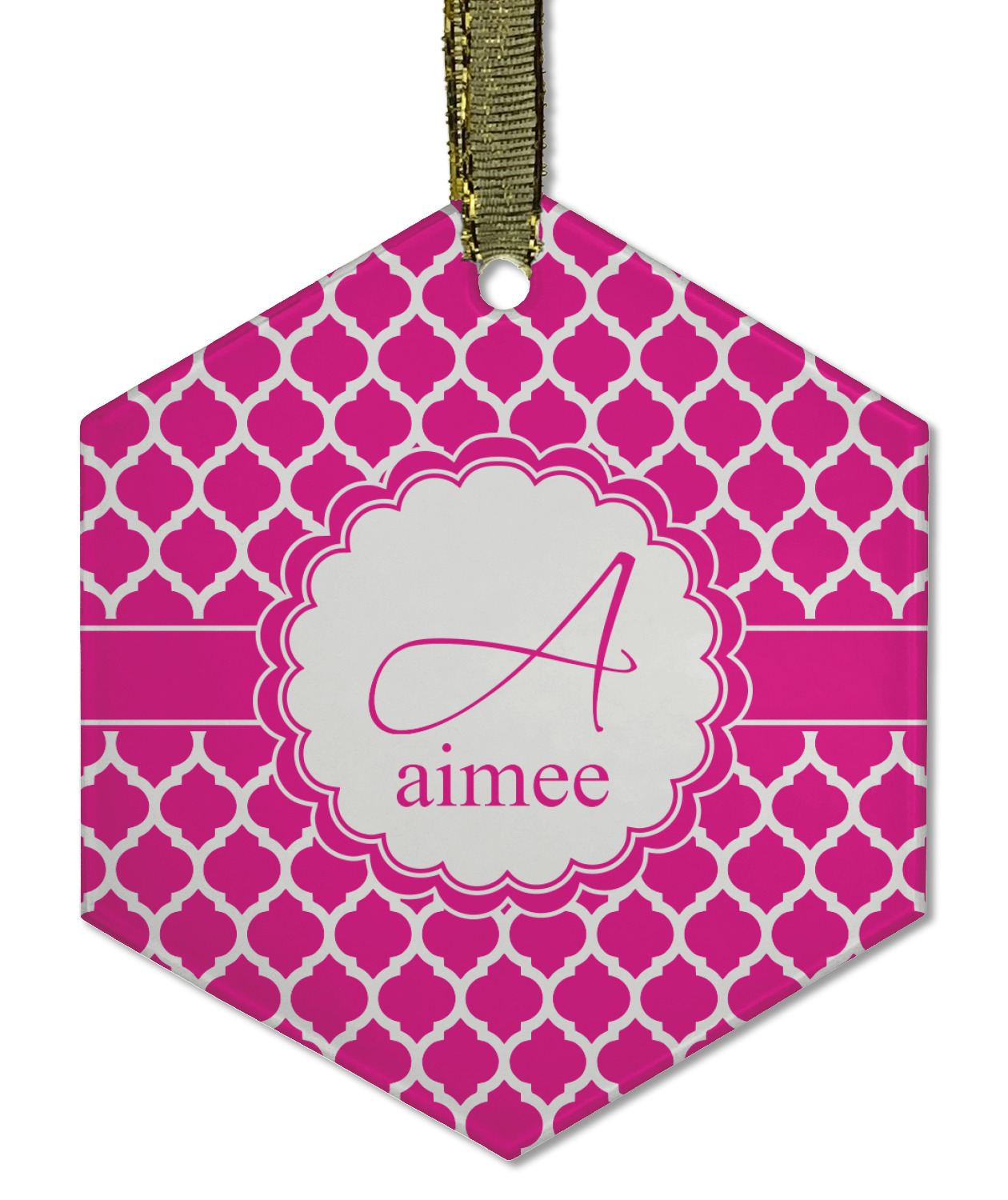 Each of our flat glass ornaments come with a gold string to hang on your Christmas tree with style! We offer two different shapes - flat, round ball or a hexagon. Both glass ornaments have a frosted coating on one side where we print your design while the other side is a clear gloss to give your personalized ornament a sheen finish. Our flat round glass ornament is approximately 3.5" x 3.5" while the flat hexagon ornaments are approximately 3.5" x 3".