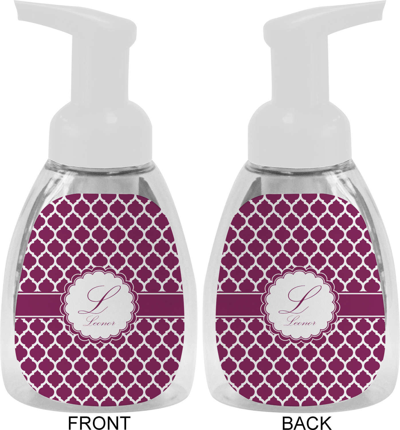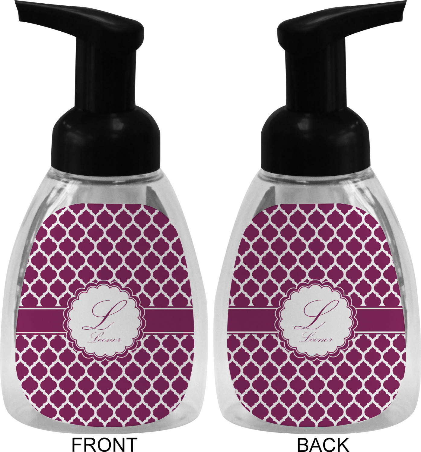 This soap dispenser is made of a robust plastic and has a clear base. The included soap pump is available in black or white color. This dispenser is 6.5 inches tall, 3 inches wide, and 2 inches deep. We display your customized designs on the front and back sides of these foaming hand soap dispensers.