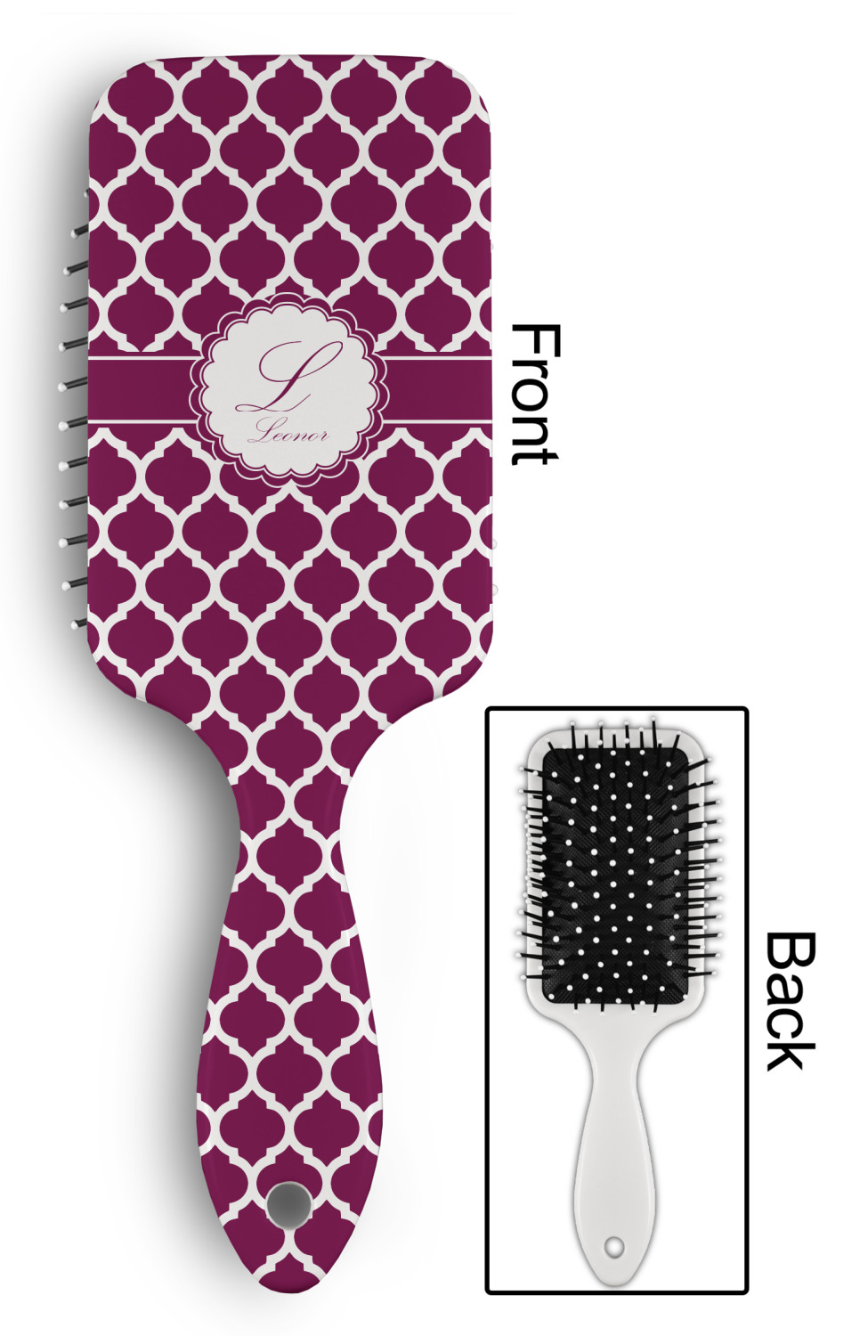 Your designed is printed on the front of the brush.; The back handle and sides are white.
