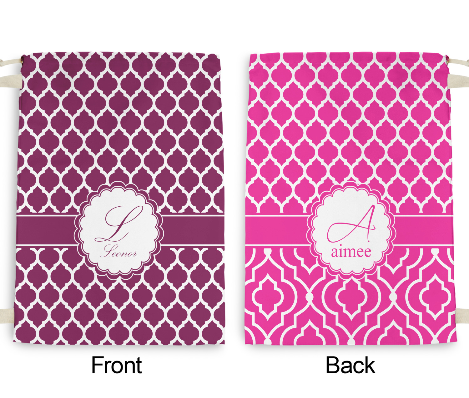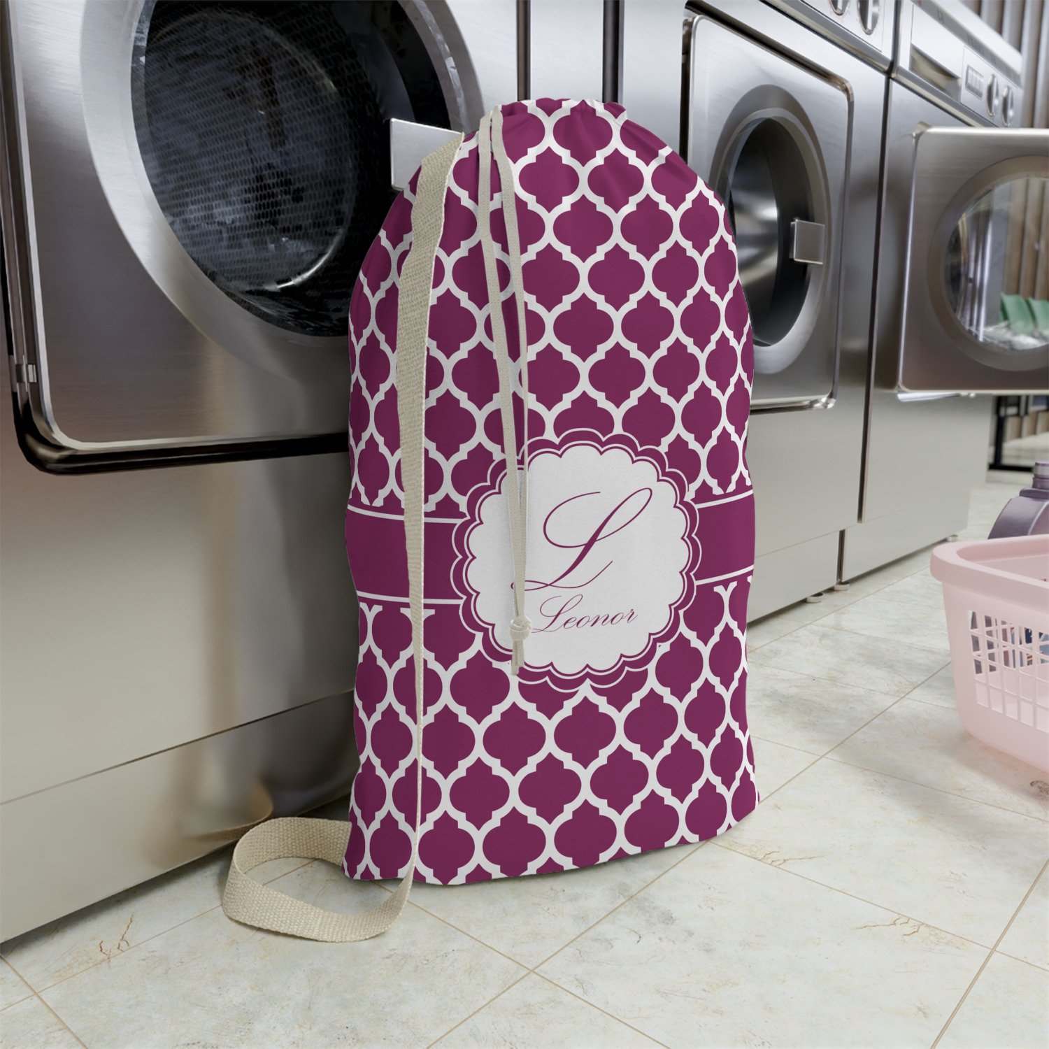 Carry your laundry in style with these customized laundry bags. Available in two sizes, featuring a natural colored woven strap and a cinch cord, these bags hold a lot of clothes or anything else you want to fit in them.