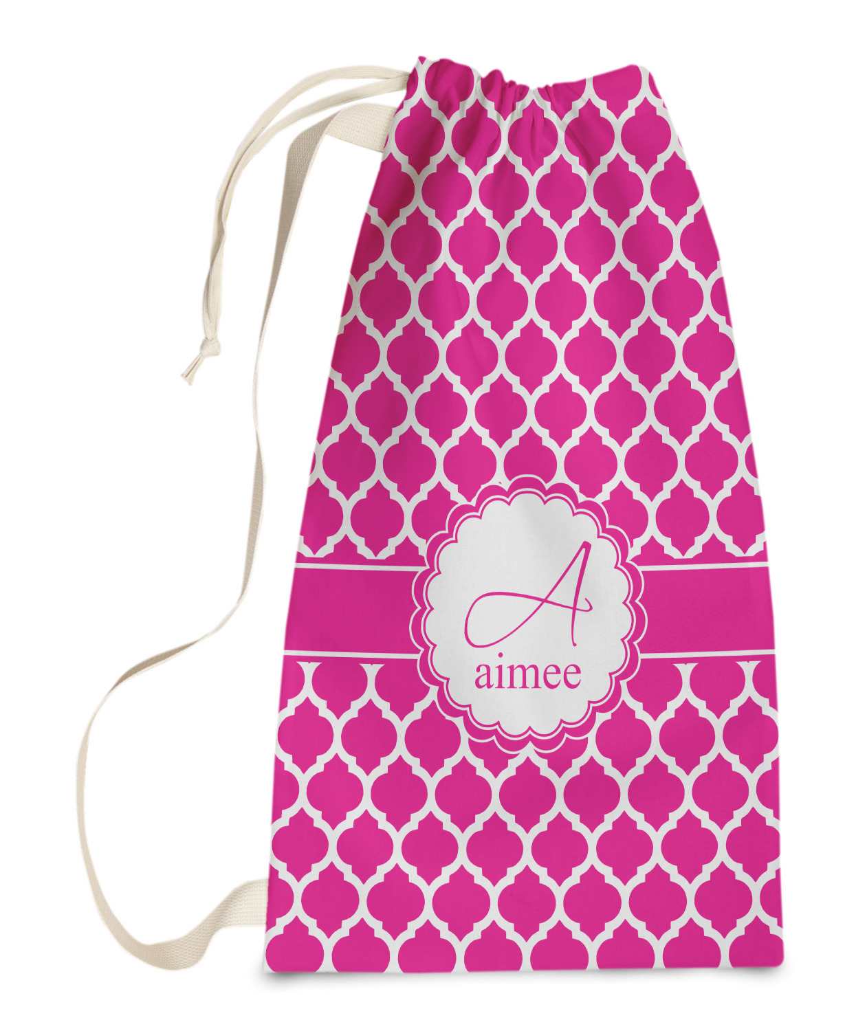 Carry your laundry in style with these customized laundry bags. Available in two sizes, featuring a natural colored woven strap and a cinch cord, these bags hold a lot of clothes or anything else you want to fit in them.