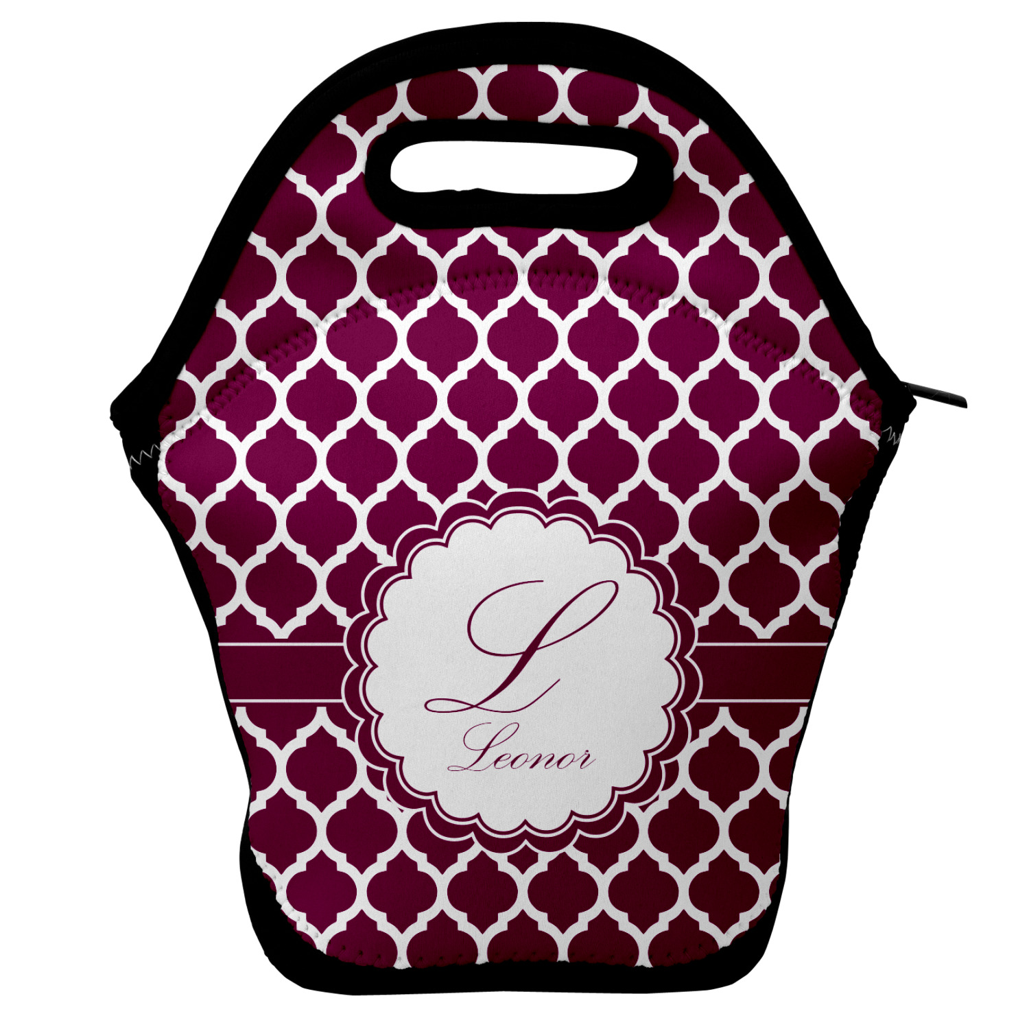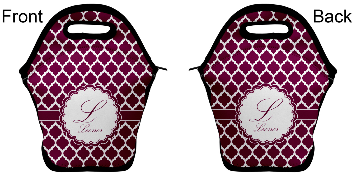 Our personalized lunch bags are made from a strong neoprene, and secure with a zipper closure that lines the top of the bag.The edges of the neoprene are sewn together with a heavy duty stitch, adding to the durability of the bag. The is accompanied by a reinforced handle at its top, for the easy transport of your lunch. We display your personalization across both the front and back of this neoprene lunch bag, while the remaining sides are a sleek black in color. Each bag measures at 13.5 inches tall, and 11.5 inches wide.