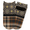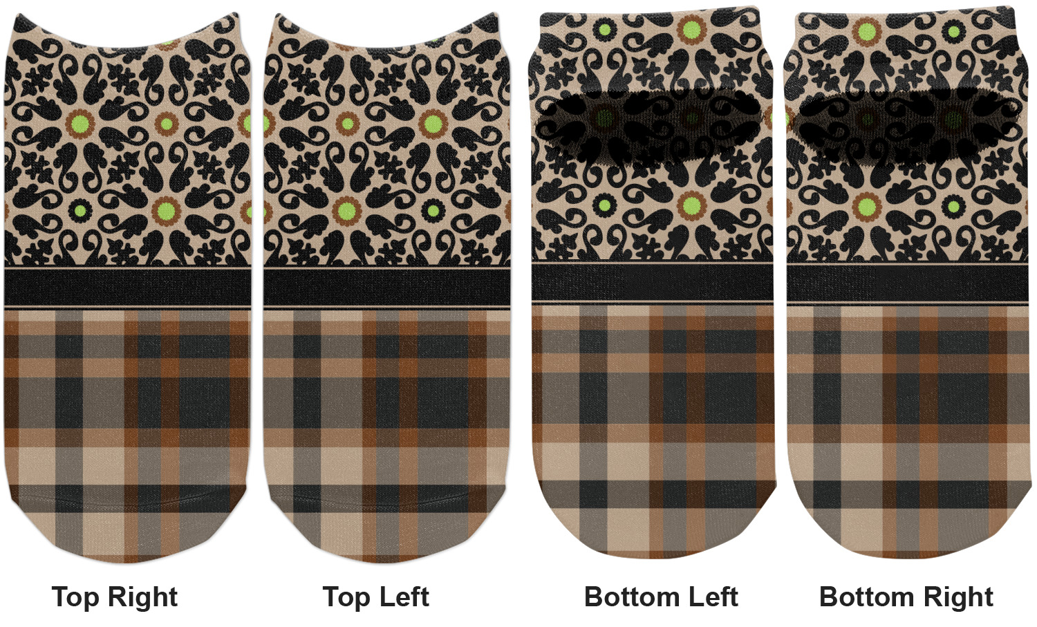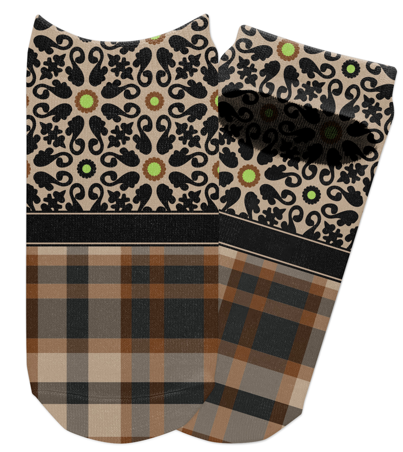 Feminine and masculine collide with this gorgeous design. The top of the design offers a fun girly flair using an abstract pattern of black, brown and lime green against a tan background to create a floral pattern. On the bottom a contrasting plaid design grounds the upper floral pattern.