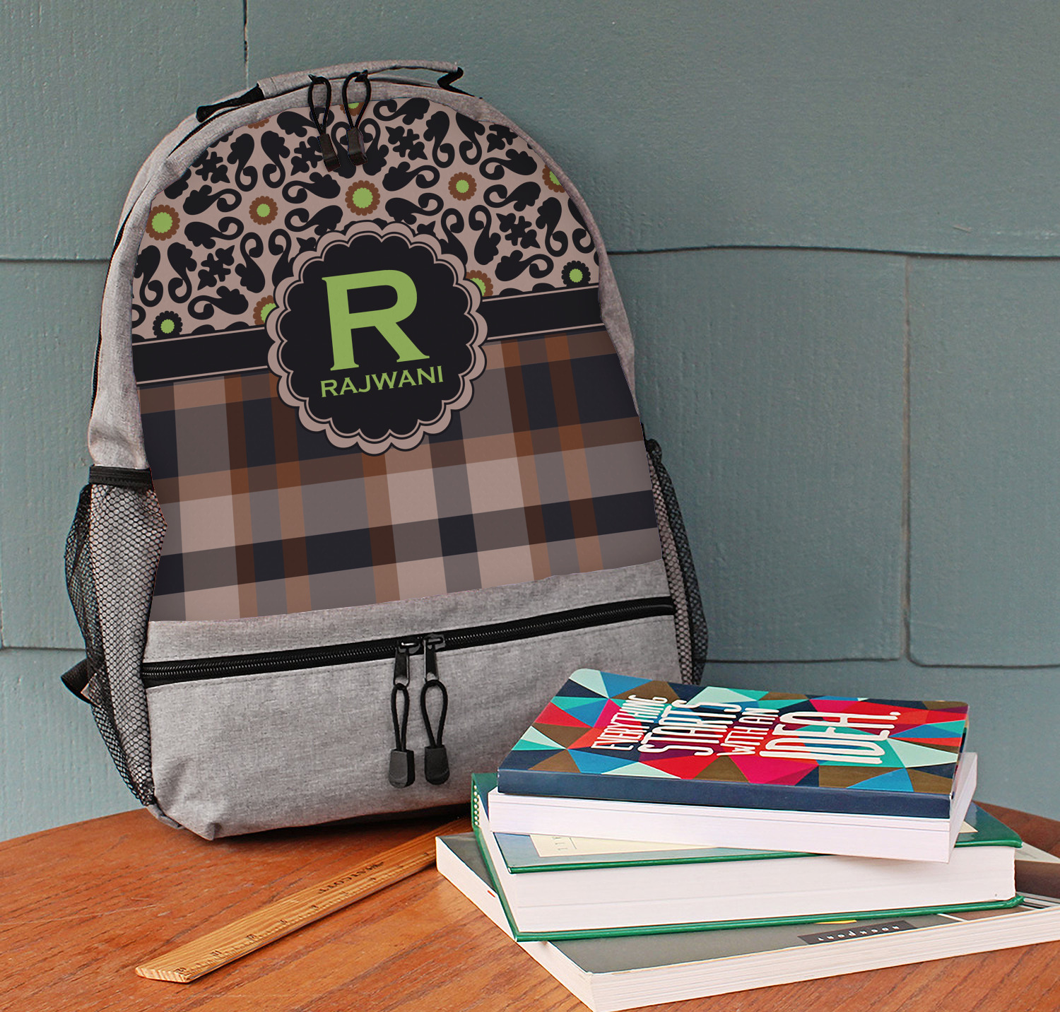 Feminine and masculine collide with this gorgeous design. The top of the design offers a fun girly flair using an abstract pattern of black, brown and lime green against a tan background to create a floral pattern. On the bottom a contrasting plaid design grounds the upper floral pattern.