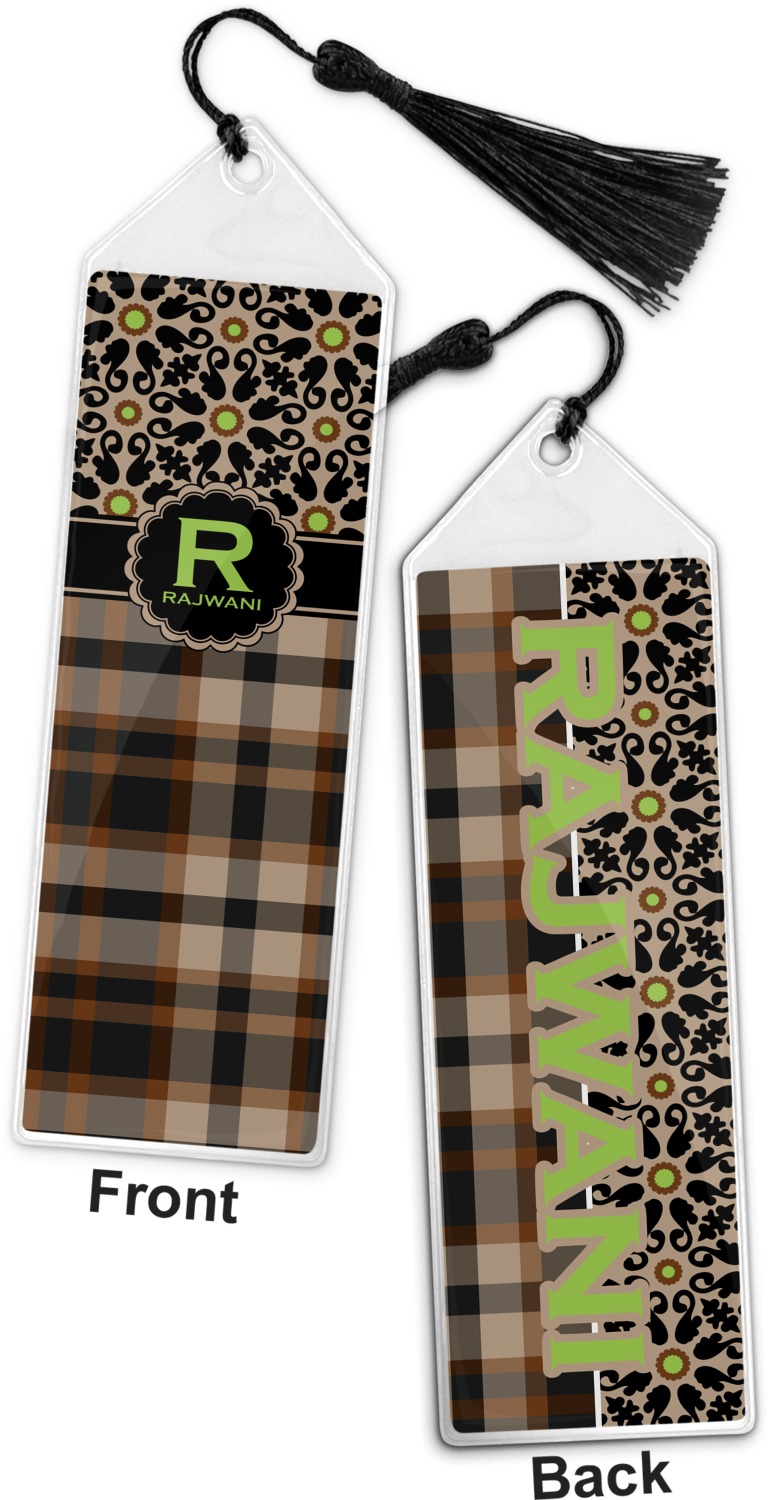 Your personalized bookmark is made of a sturdy, clear vinyl, and is approximately 7.5" x 2.25". We display your personalization on vinyl inserts that are placed on both sides. Accompanying each book marker is a black, fringe tassel that attaches to the reinforced, triangular header.