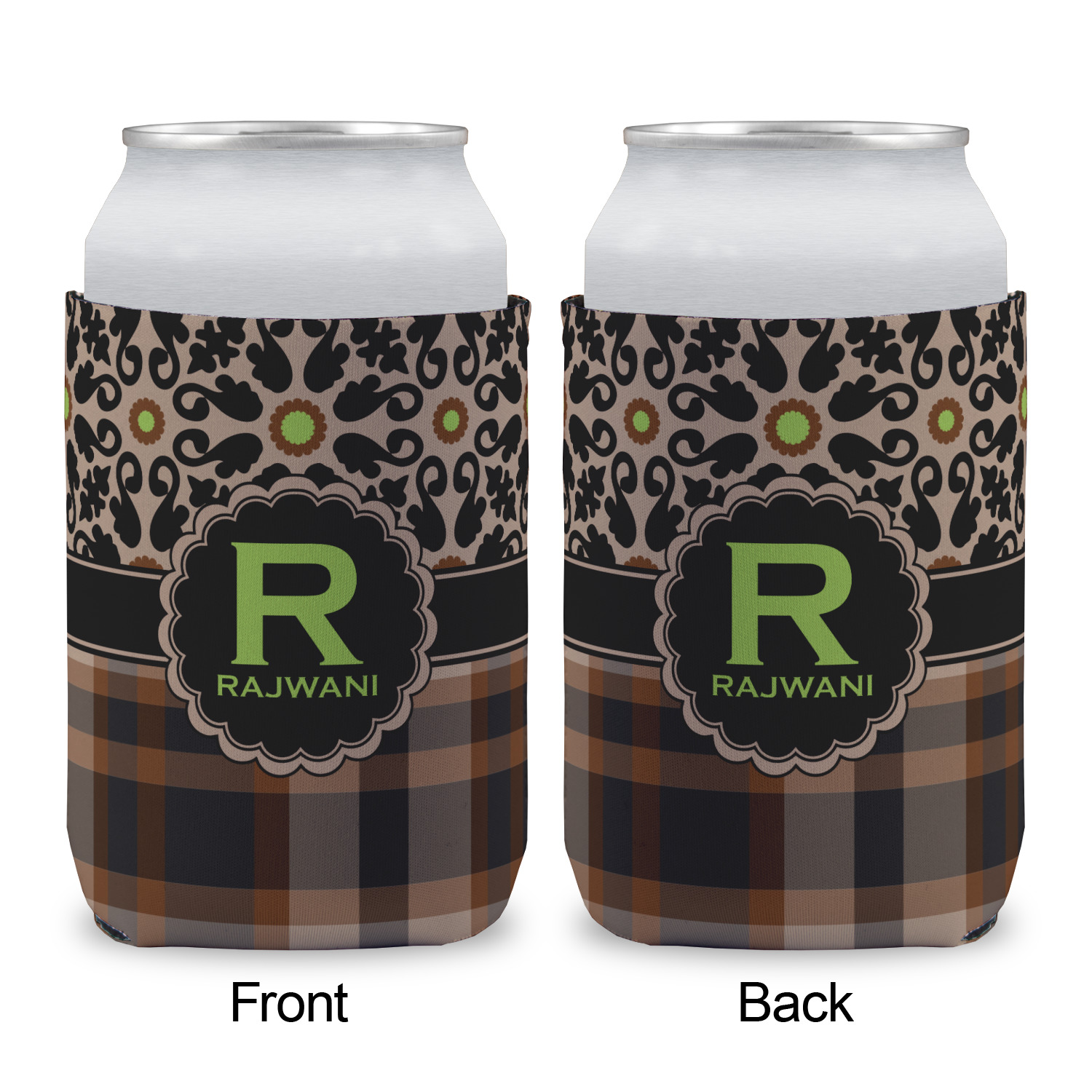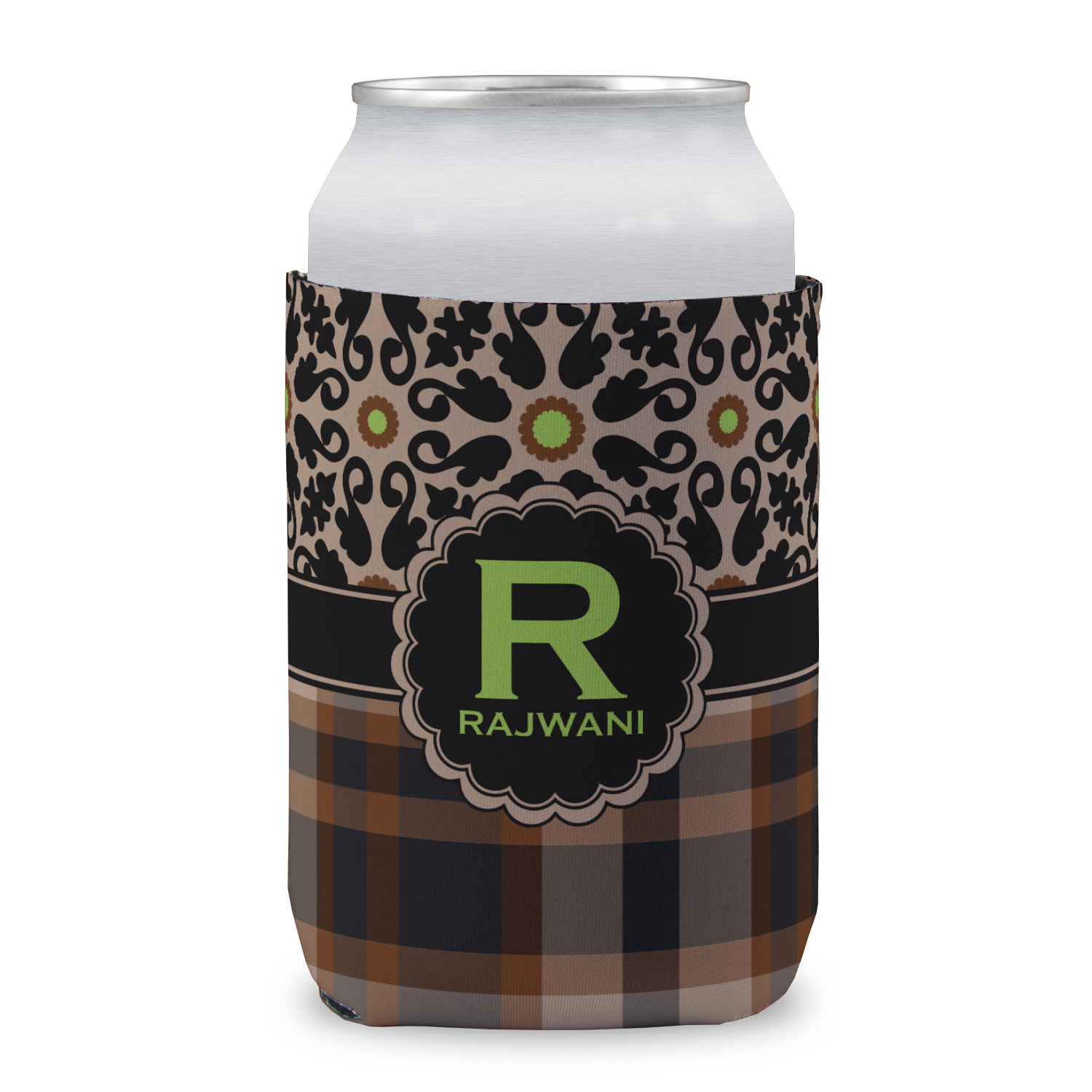 Feminine and masculine collide with this gorgeous design. The top of the design offers a fun girly flair using an abstract pattern of black, brown and lime green against a tan background to create a floral pattern. On the bottom a contrasting plaid design grounds the upper floral pattern.
