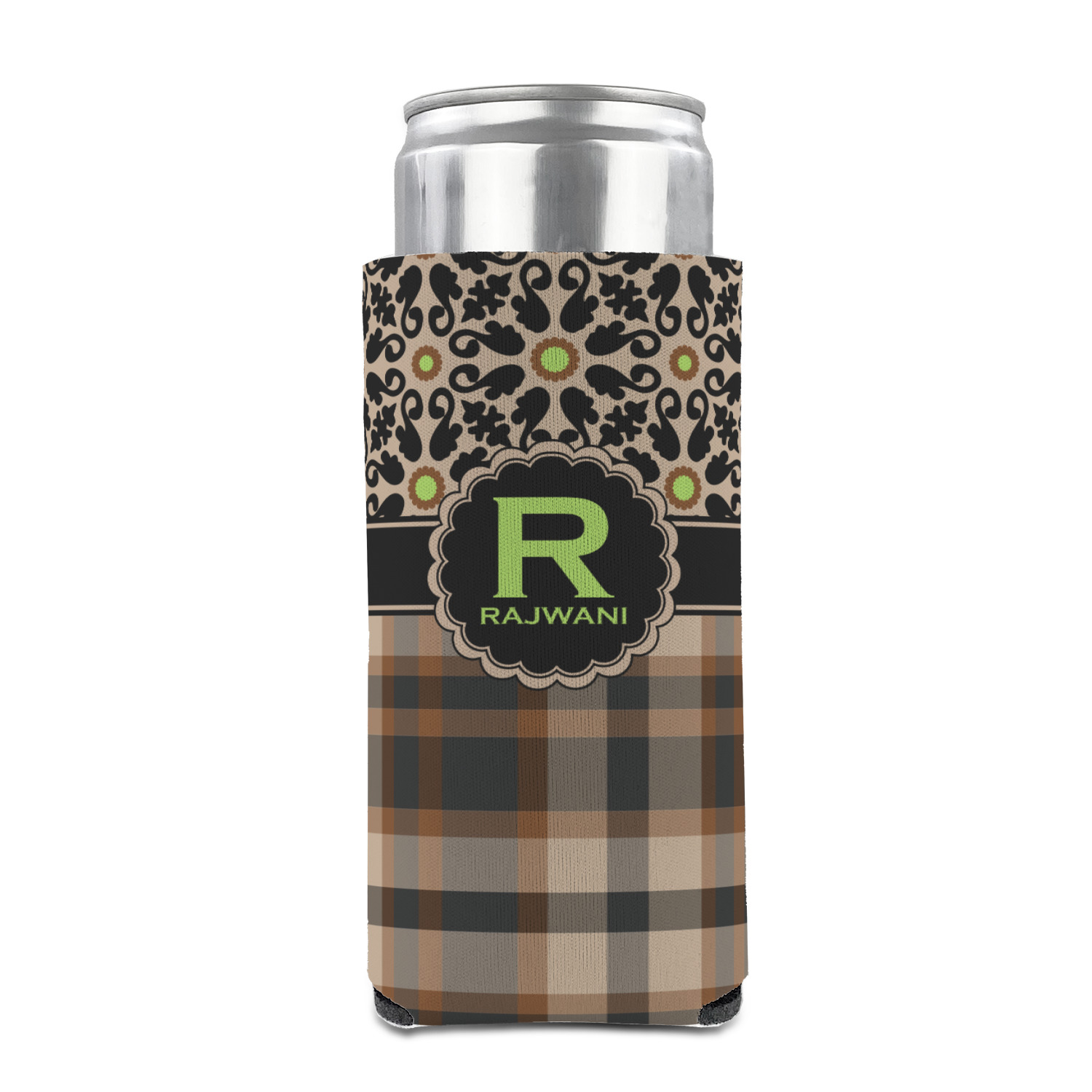 Feminine and masculine collide with this gorgeous design. The top of the design offers a fun girly flair using an abstract pattern of black, brown and lime green against a tan background to create a floral pattern. On the bottom a contrasting plaid design grounds the upper floral pattern.