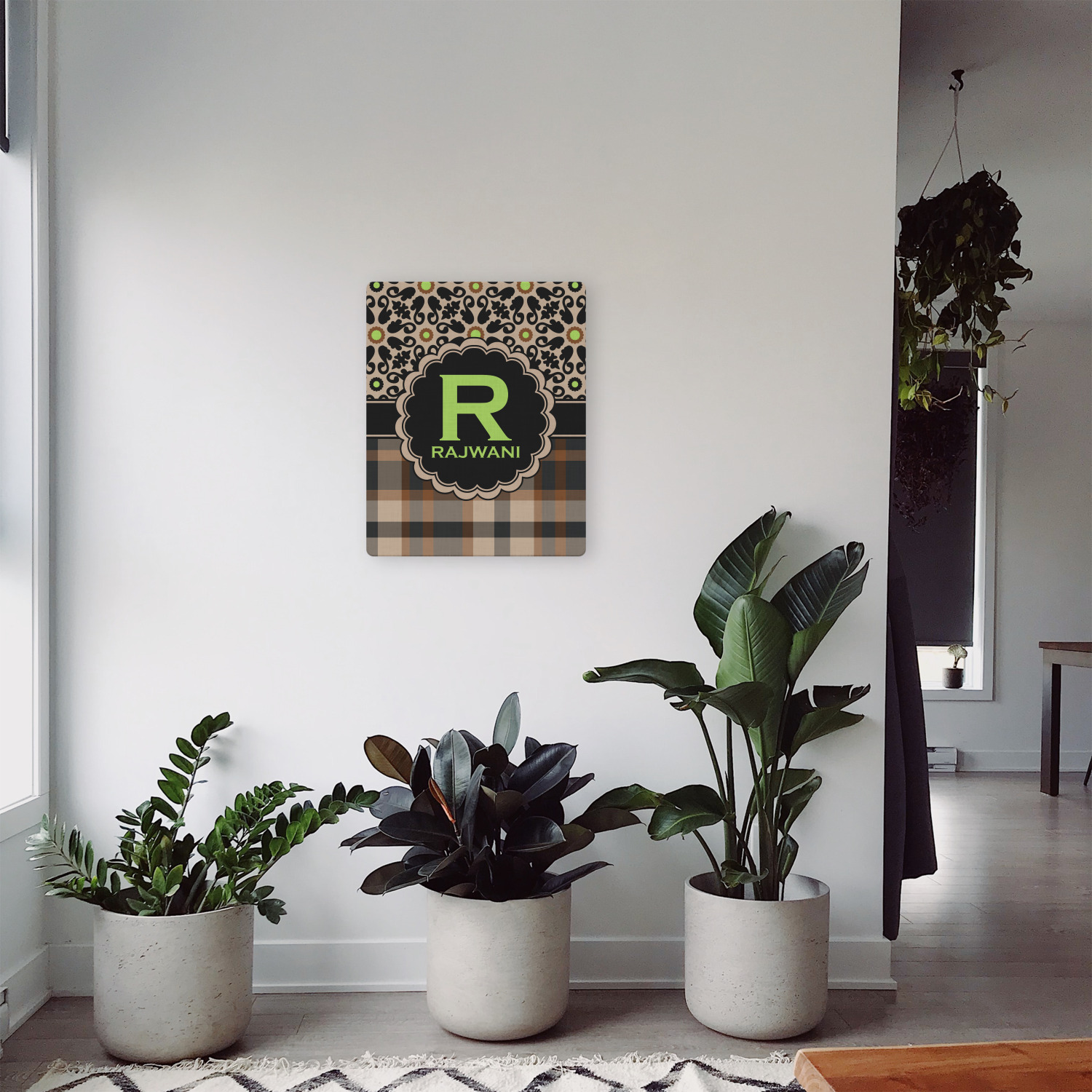 Feminine and masculine collide with this gorgeous design. The top of the design offers a fun girly flair using an abstract pattern of black, brown and lime green against a tan background to create a floral pattern. On the bottom a contrasting plaid design grounds the upper floral pattern.