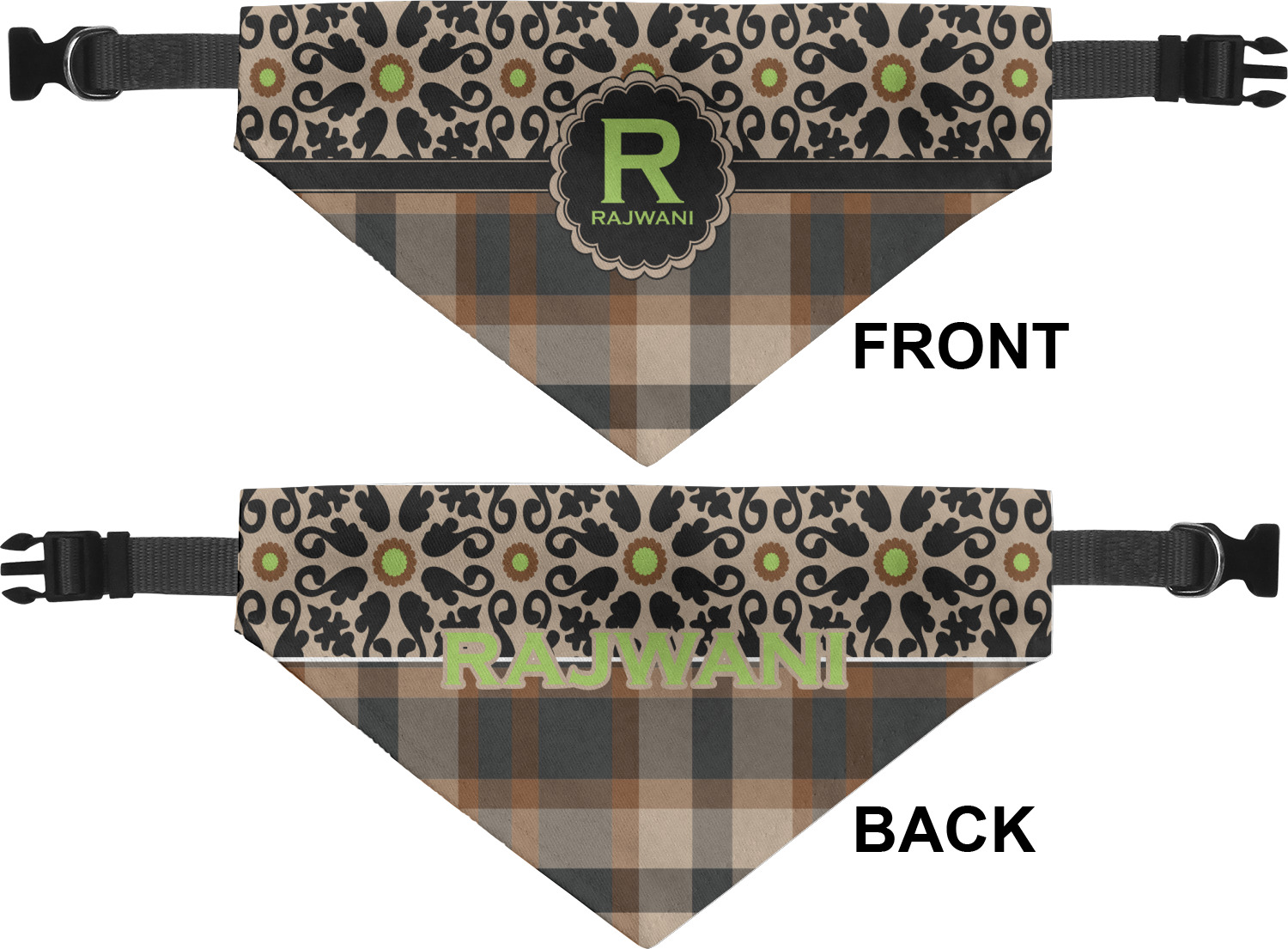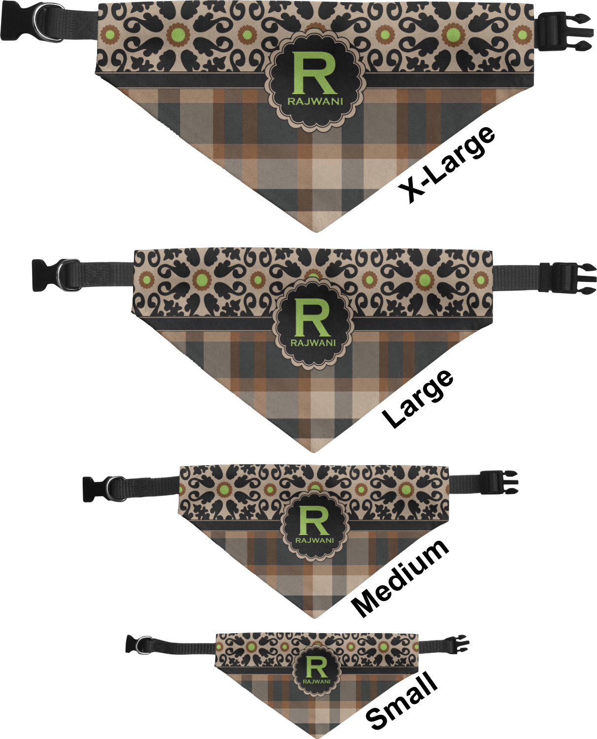 We print the front and back of these dog bandanas with your customized design. The bandana itself is made from a durable polyester, sewn together with a gap large enough to accommodate any collar. Regardless, the bandana includes a plain black, canvas collar with plastic snaps, that can easily be removed if desired. These dog bandana collars are available in four sizes: small, medium, large, and extra large. Please see our sizing chart for more information regarding the dimensions of each size.