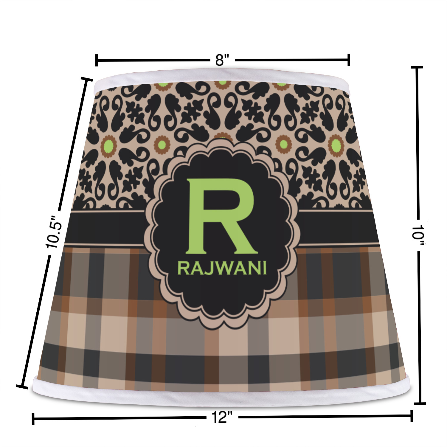 The base of this lampshade is 12 inches in diameter, and the top spans 8 inches in diameter. The total height of the lampshade is 10 inches. The angled nature of this custom lampshade concentrates the light, making it ideal for smaller spaces. This lampshade is made of matte, polyfilm, and displays your customization in its middle. The top and bottom of this colorful lamp shade are lined with a white fabric ribbon (which can be replaced with black inside the design studio) which frames your design and creates a sophisticated finish. As an UNO fitter lampshade, this unique lamp shade will fit a variety of bases.