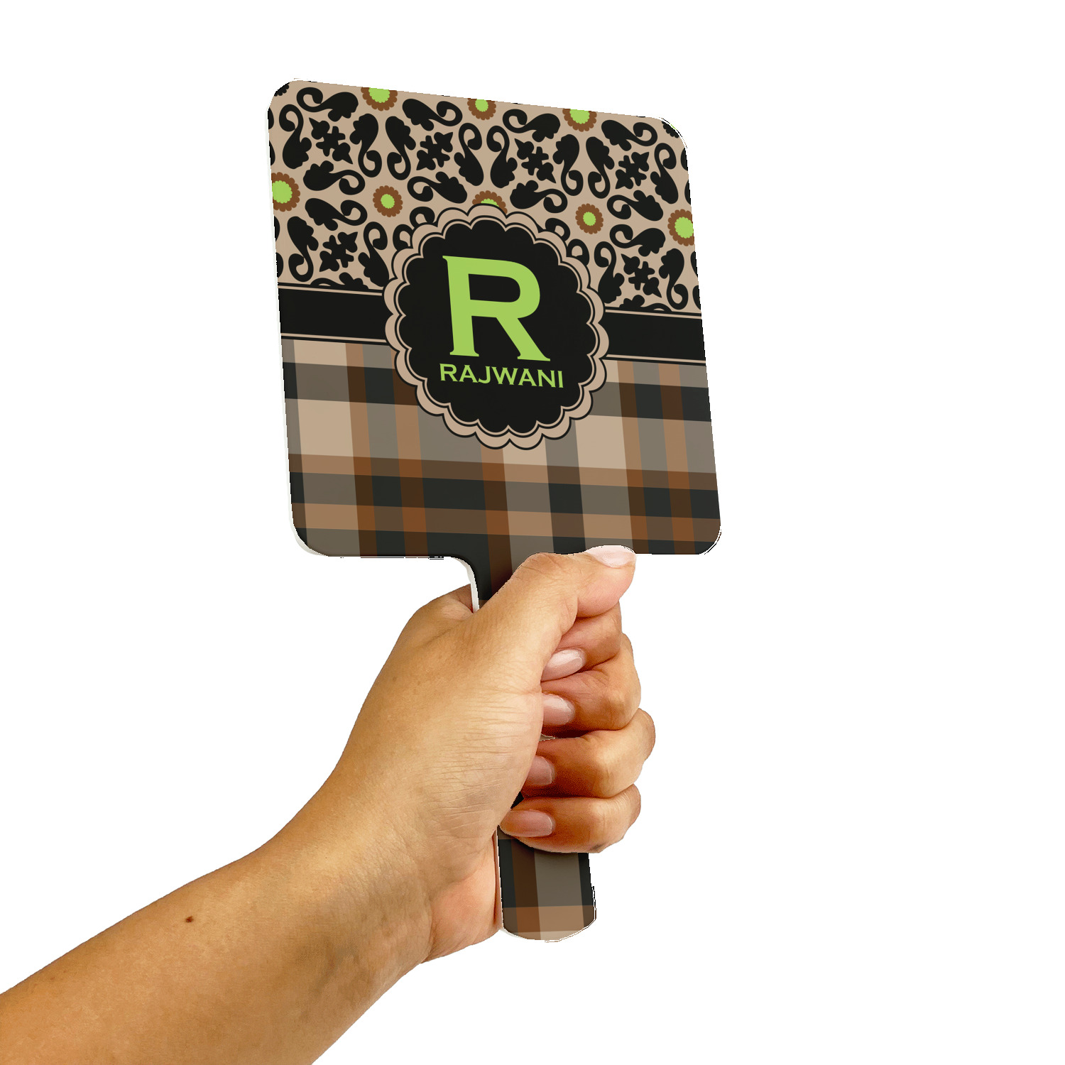 Feminine and masculine collide with this gorgeous design. The top of the design offers a fun girly flair using an abstract pattern of black, brown and lime green against a tan background to create a floral pattern. On the bottom a contrasting plaid design grounds the upper floral pattern.