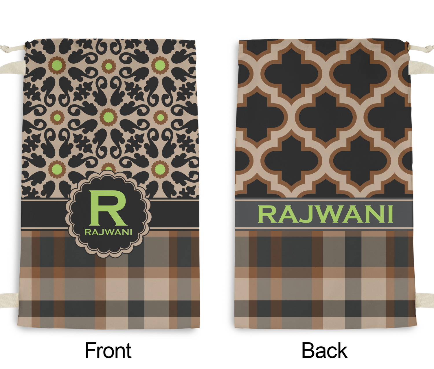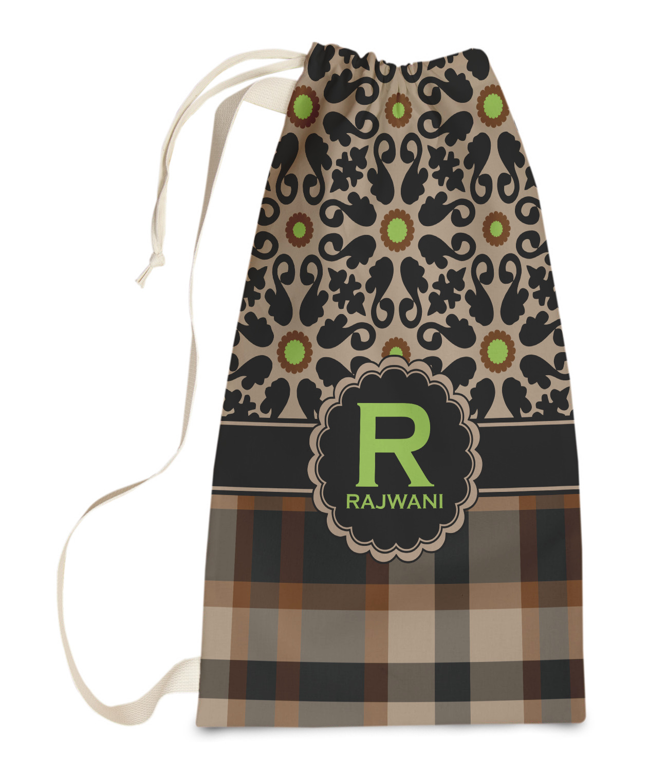Carry your laundry in style with these customized laundry bags. Available in two sizes, featuring a natural colored woven strap and a cinch cord, these bags hold a lot of clothes or anything else you want to fit in them.
