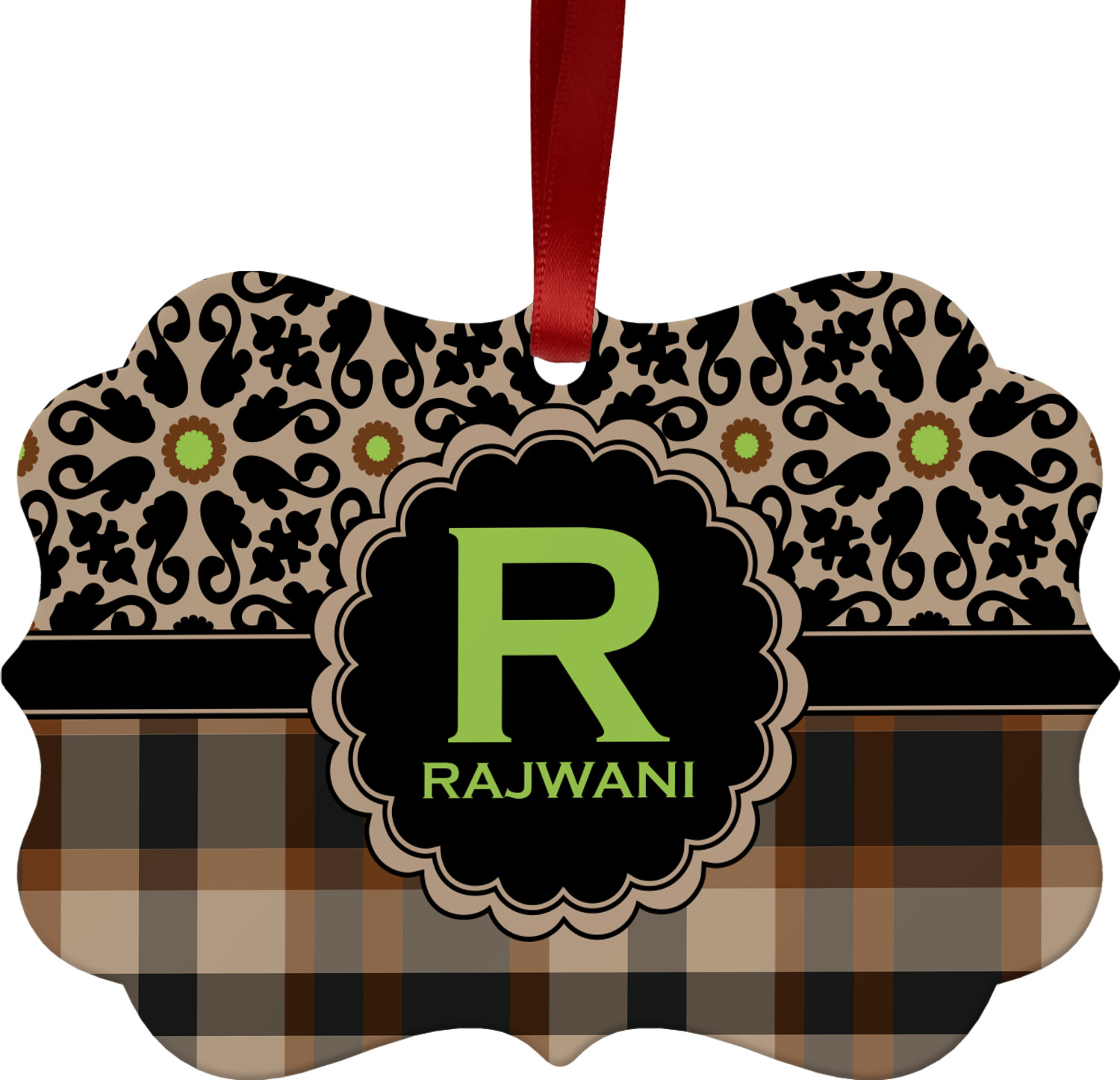 Feminine and masculine collide with this gorgeous design. The top of the design offers a fun girly flair using an abstract pattern of black, brown and lime green against a tan background to create a floral pattern. On the bottom a contrasting plaid design grounds the upper floral pattern.