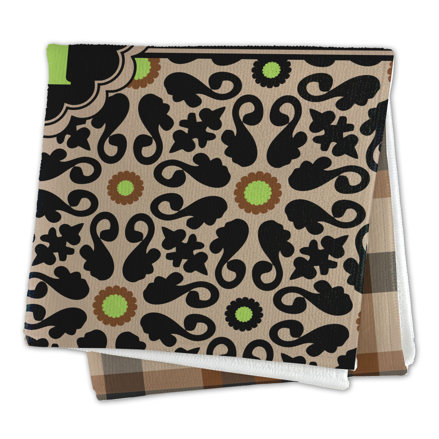 Feminine and masculine collide with this gorgeous design. The top of the design offers a fun girly flair using an abstract pattern of black, brown and lime green against a tan background to create a floral pattern. On the bottom a contrasting plaid design grounds the upper floral pattern.