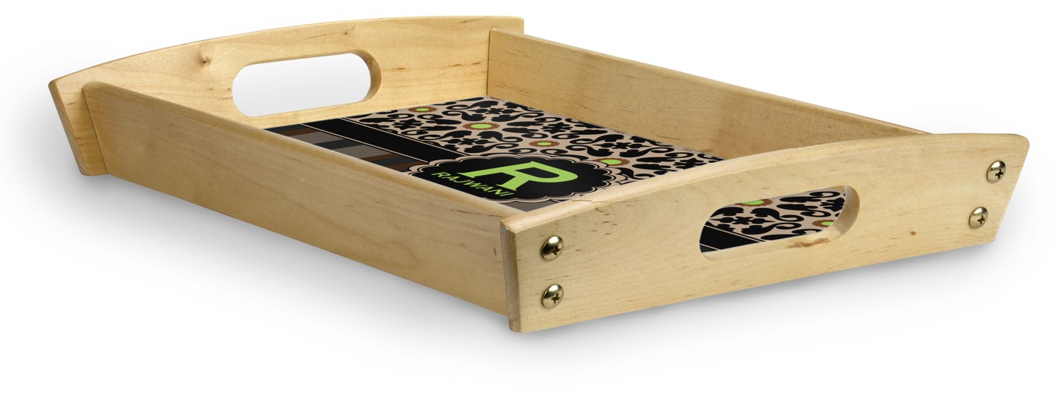 This serving tray with handles features square edges and two rounded sides, creating a very modern look. Each side is fabricated from a beautifully cut, natural wood. The bottom of the interior of the tray displays your customized design in bright, vibrant color. The tray is sold in both a black color and a natural wood look. Each variation of the wood serving tray has two sizes: Small, which is 14" x 10" x 2.25", and Large, which is 19.5" x 13.5" x 2.75".