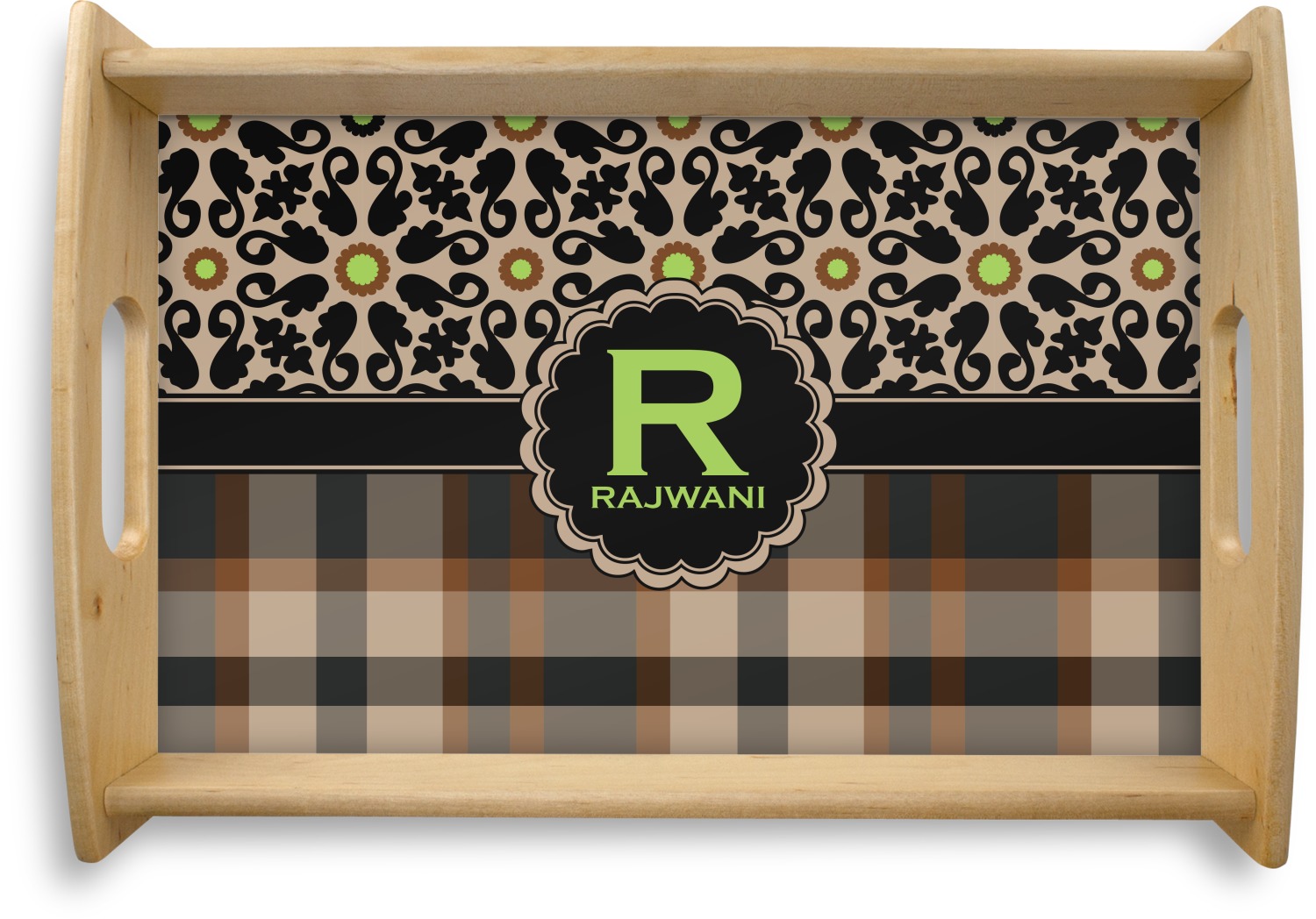 This serving tray with handles features square edges and two rounded sides, creating a very modern look. Each side is fabricated from a beautifully cut, natural wood. The bottom of the interior of the tray displays your customized design in bright, vibrant color. The tray is sold in both a black color and a natural wood look. Each variation of the wood serving tray has two sizes: Small, which is 14" x 10" x 2.25", and Large, which is 19.5" x 13.5" x 2.75".