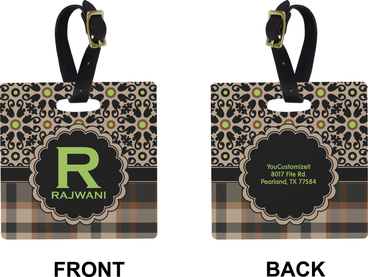 These personalized bag tags are sold in a variety of shapes, so that you may find the product that meets your vision exactly. We sell a round luggage tag, which measures at approximately 4" x 4". Our square luggage tag is about 3.5" x 3.5", while our rectangular version is 2.75" x 4 ".