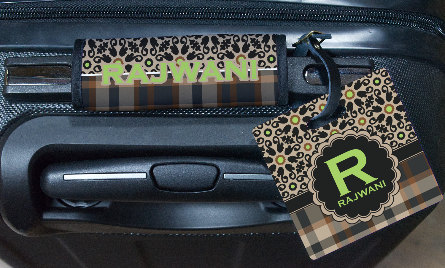 Feminine and masculine collide with this gorgeous design. The top of the design offers a fun girly flair using an abstract pattern of black, brown and lime green against a tan background to create a floral pattern. On the bottom a contrasting plaid design grounds the upper floral pattern.