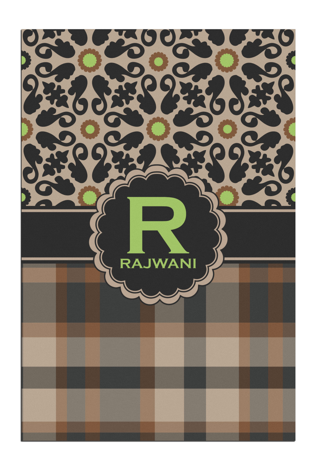 Feminine and masculine collide with this gorgeous design. The top of the design offers a fun girly flair using an abstract pattern of black, brown and lime green against a tan background to create a floral pattern. On the bottom a contrasting plaid design grounds the upper floral pattern.