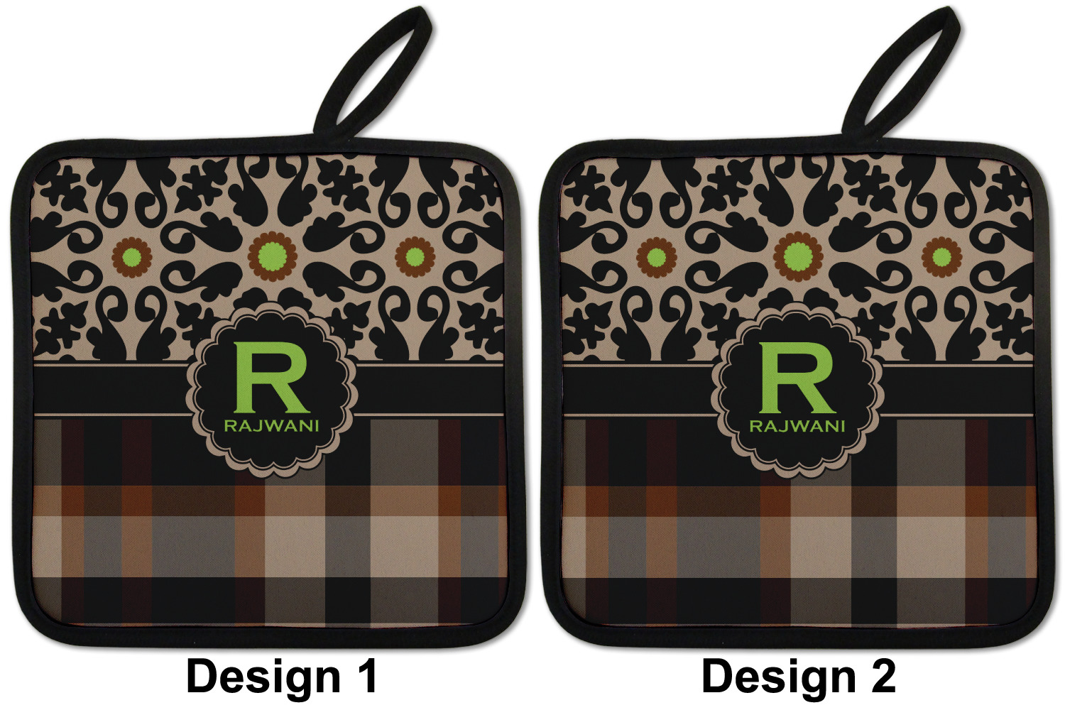 Our personalized pot holders feature a neoprene front that displays your personalization in vibrant colors. The backing of the hot pot holder is rubberized; the textured backing allows you to have a great grip when using this custom pot holder. The two materials are joined with a sleek, black trim, and the holder also includes an attached loop for hanging and storage. The pot holder is approximately 8.75 inches by 8.75 inches and 0.25 inches tall, while the fabric loop is 2.5 inches long. You can purchase a kitchen pot holder by itself or as a set of 2. We also offer a set including one pot holder and one oven mitt.