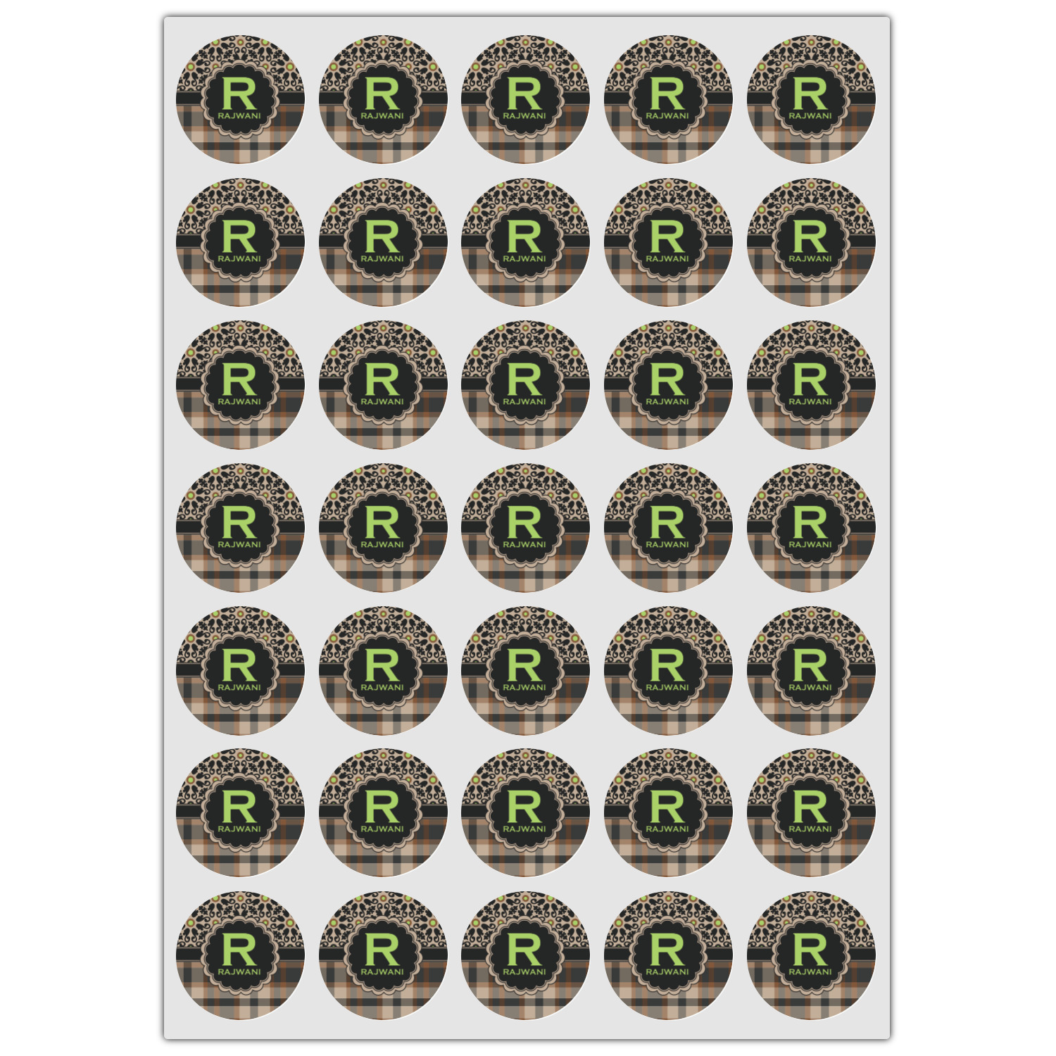 A wide band of black with tan trim pulls the design together. A feminine scalloped black circle label that is trimmed in double rows of tan will provide the focal point for personalization of your choice.