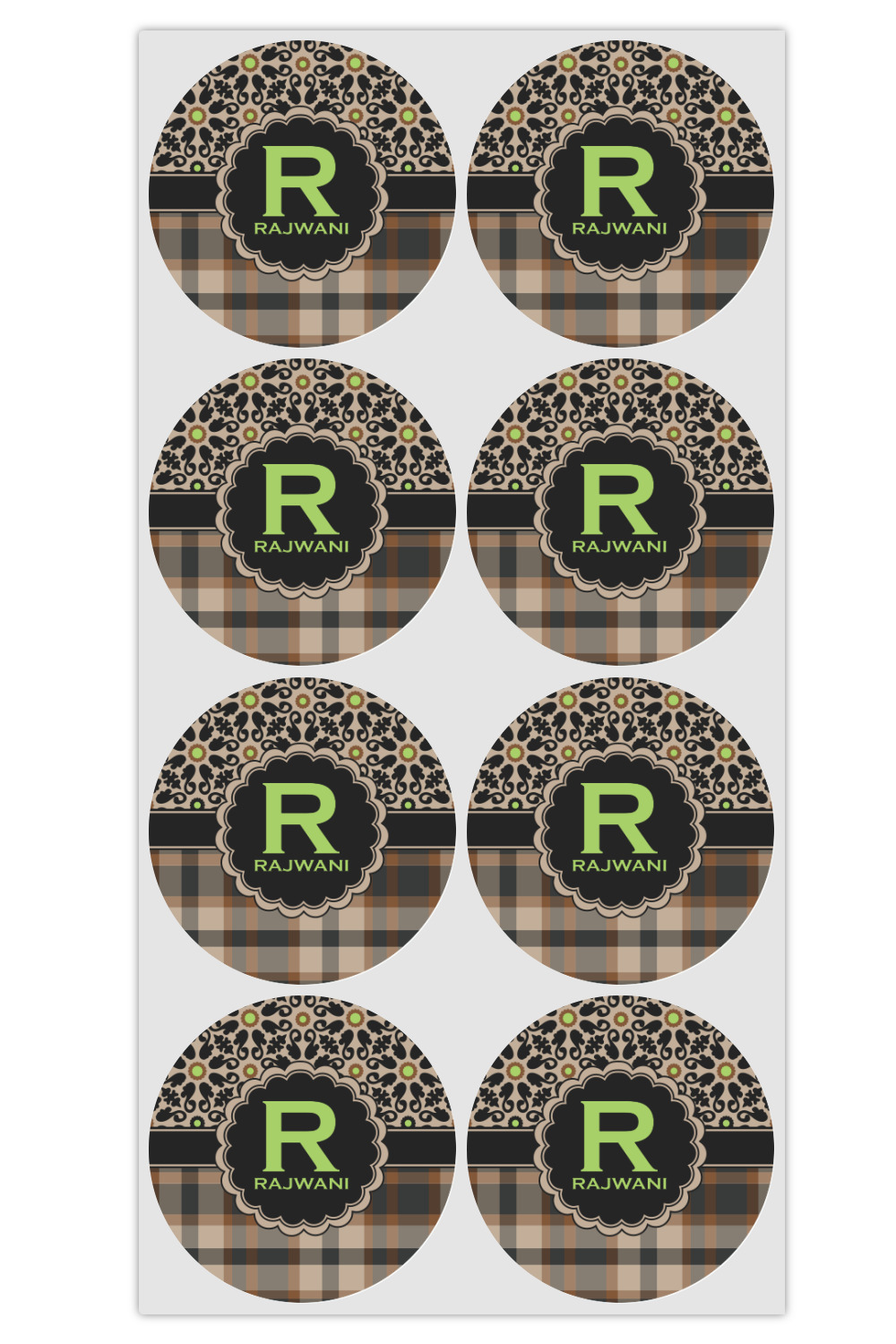 A wide band of black with tan trim pulls the design together. A feminine scalloped black circle label that is trimmed in double rows of tan will provide the focal point for personalization of your choice.