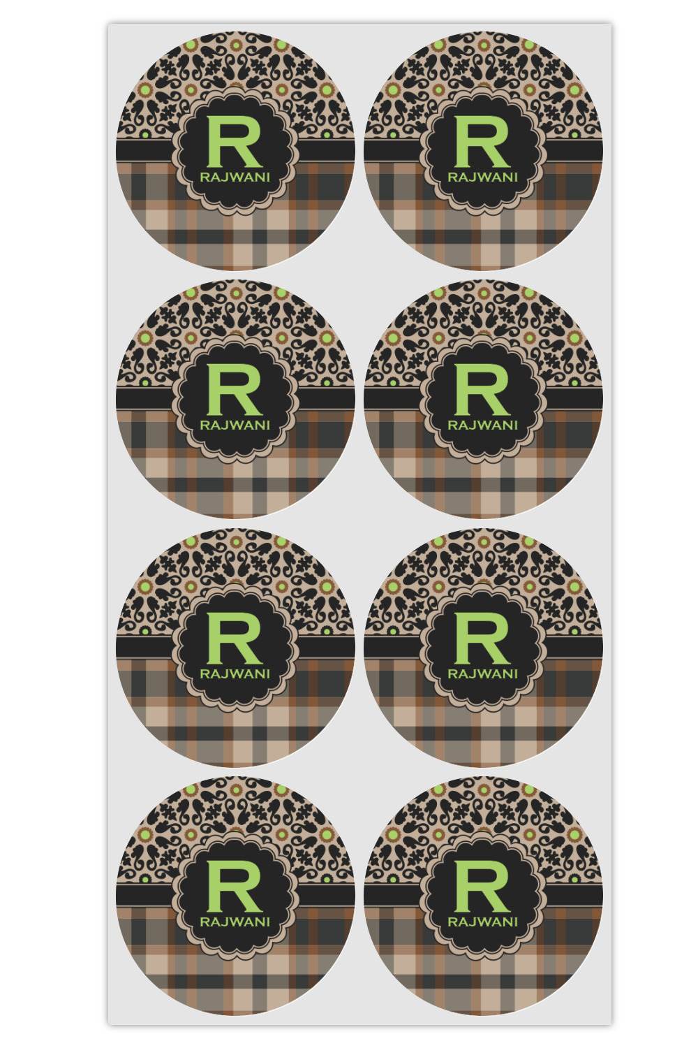 A wide band of black with tan trim pulls the design together. A feminine scalloped black circle label that is trimmed in double rows of tan will provide the focal point for personalization of your choice.