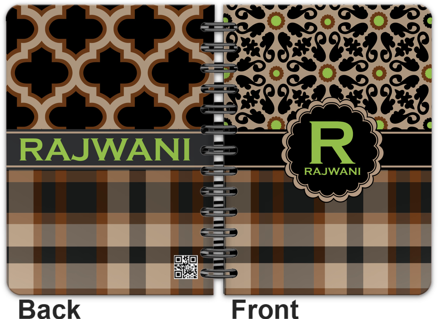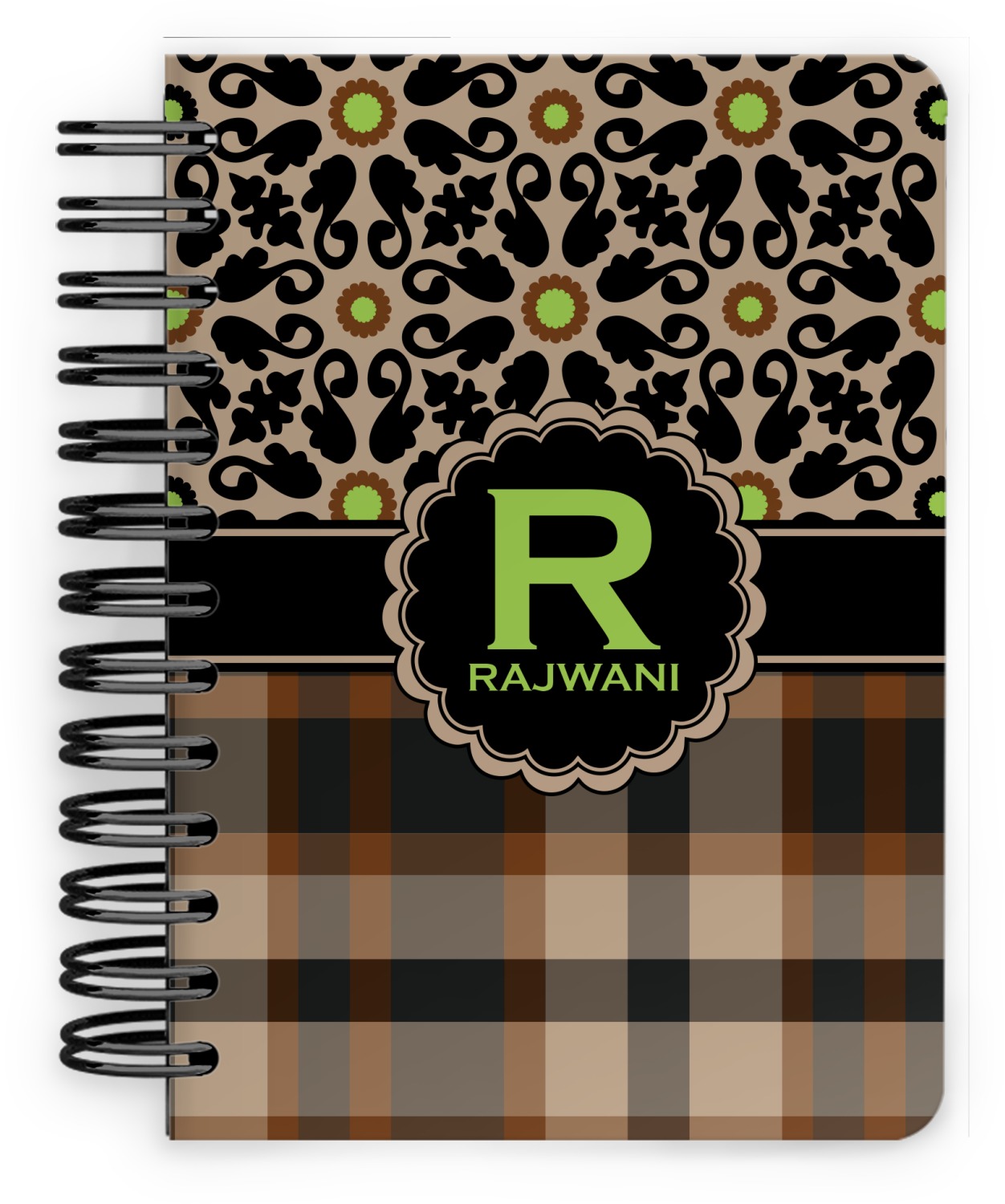 This spiral notebook includes 75 sheets of thick, ruled paper. The front and back of this custom notebook is made of a robust, laminate, plastic covering. We print your personalization on these two panels, underneath a glossy finish, which emphasizes the colors of your design. The two panels and the sheets of paper are held together by a sturdy, black coil. The paper within your bound notebook is perforated for easy, clean tearing.