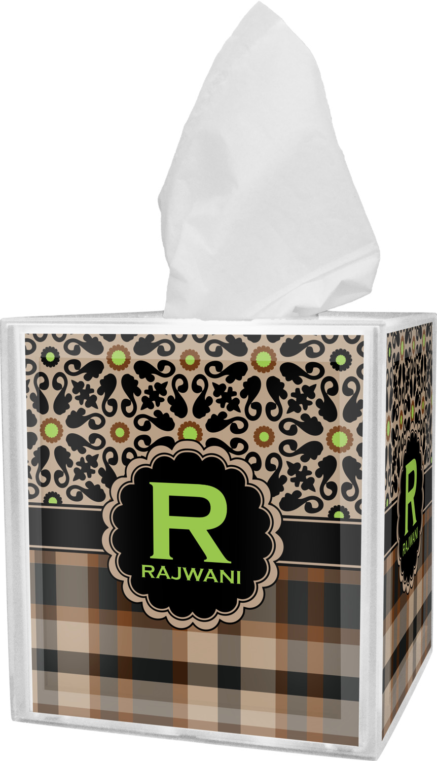 These tissue holders are built from durable acrylic and display your unique personalization on fine-quality vinyl inserts placed within the four sides and top. The box features two pieces, allowing you to easily switch out tissue boxes. On the sides, youll find ridges that ensure the top and base fit securely in place. The bottom of these tissue box holders has four, rubber, non-slip pads to prevent the box from scuffing any surface you decide to display it on. Each box can fit a standard 5 by 5-inch box of tissues.
