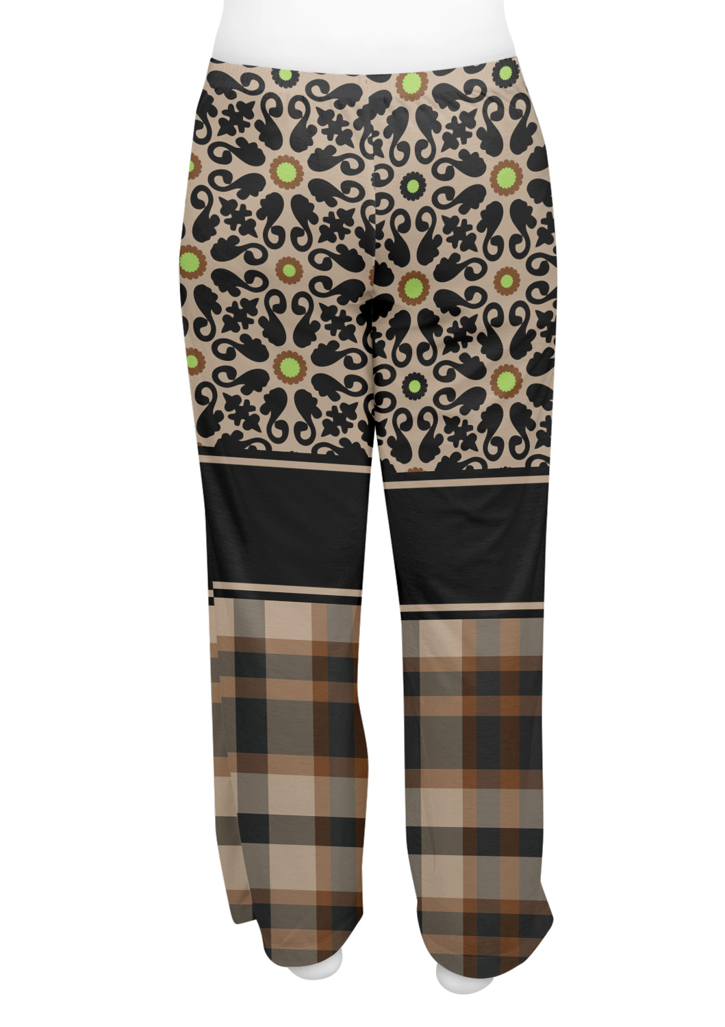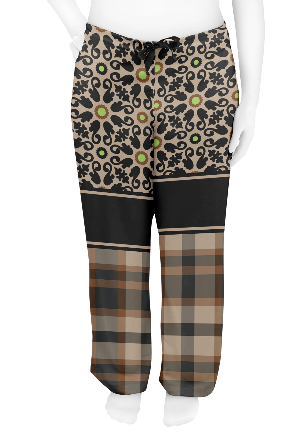 Feminine and masculine collide with this gorgeous design. The top of the design offers a fun girly flair using an abstract pattern of black, brown and lime green against a tan background to create a floral pattern. On the bottom a contrasting plaid design grounds the upper floral pattern.
